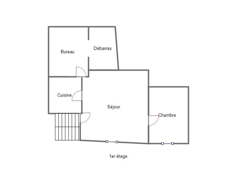 Premier étage : salle d'eau avec WC, séjour, cuisine, bureau, débarras et chambre.