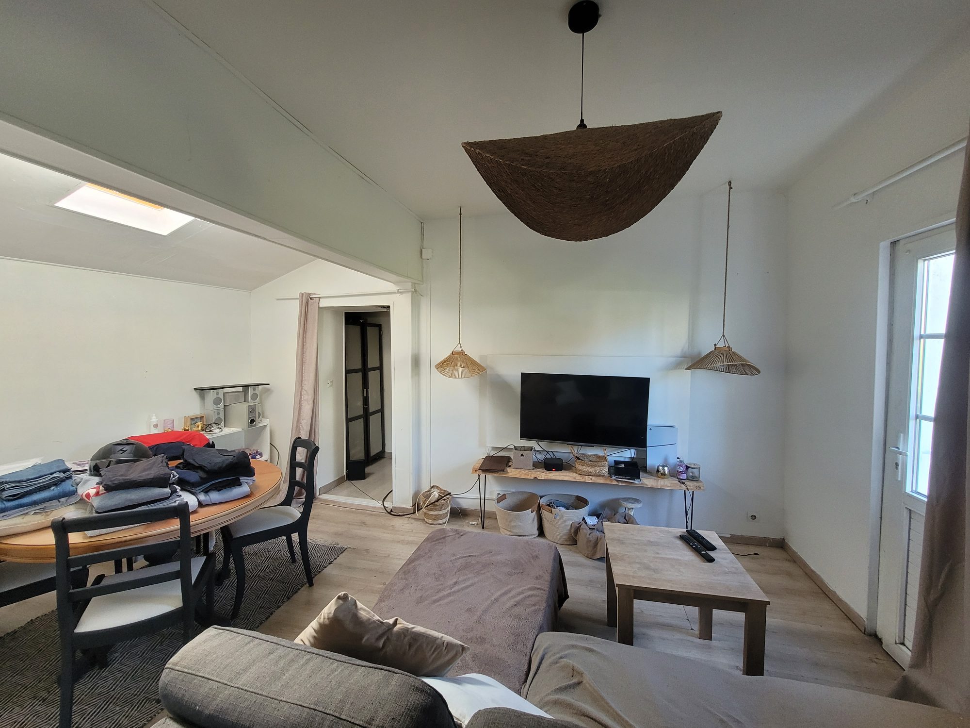 Un salon avec salle à manger, cuisine ouverte, couloir, salle d'eau avec wc, chambre, bureau.