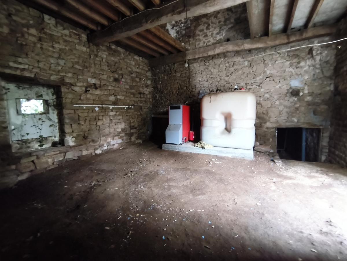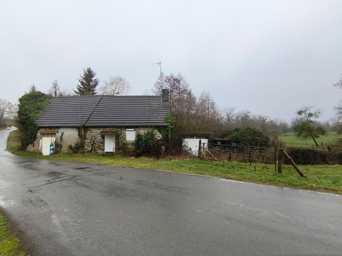 Dans hameau en campagne, maison à rénover de 2 pièces principales avec garage sur 2.900 m² de terrain.