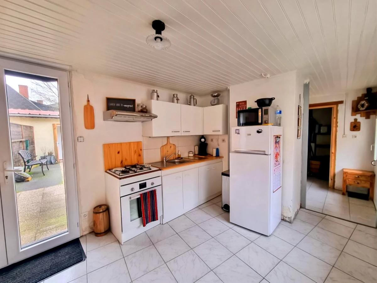 Cette maison rénovée offre au rez-de-chaussée une belle pièce de vie avec cuisine ouverte de 38m², une salle d'eau avec douche et meuble vasque, un cellier et WC.