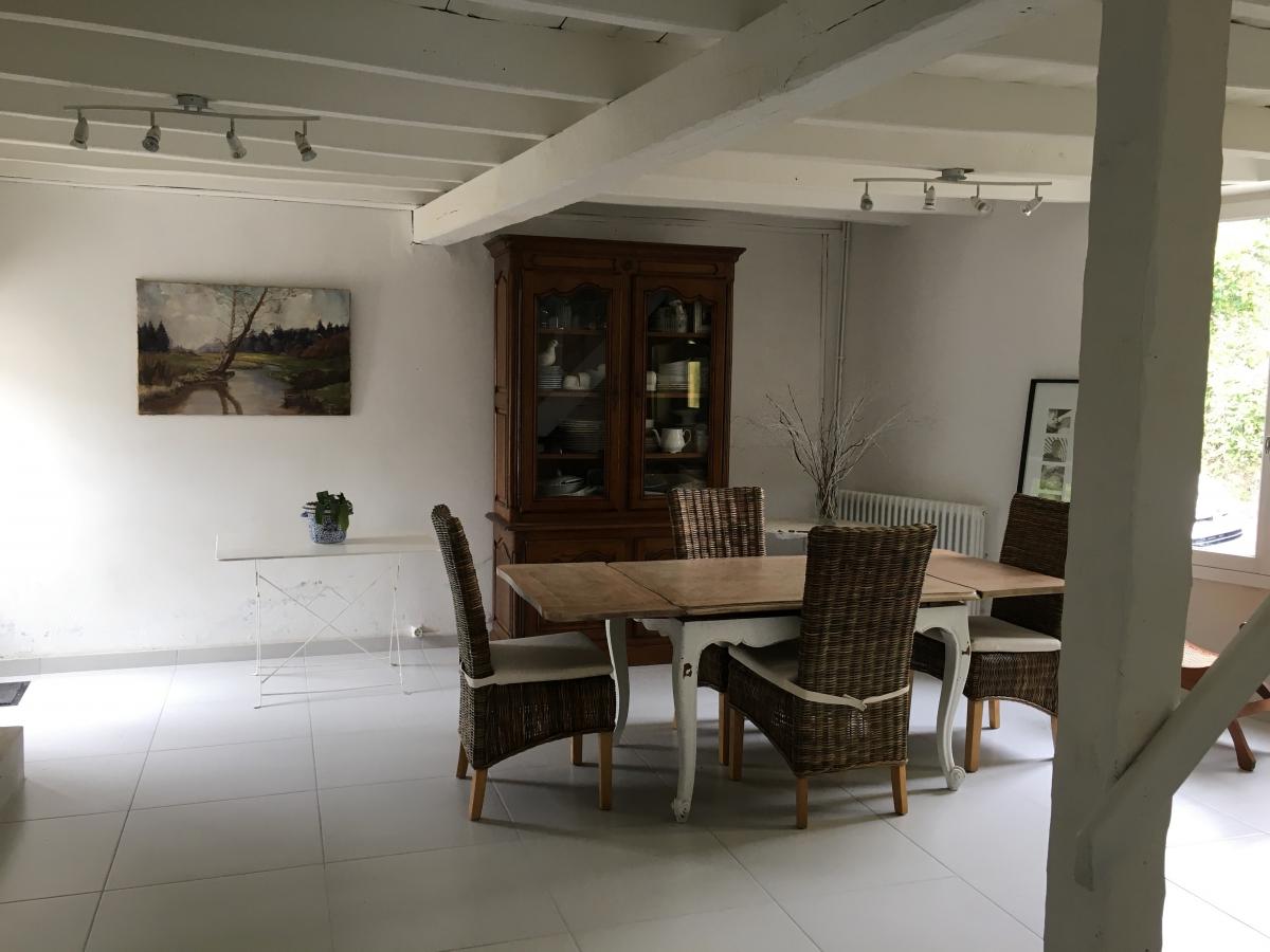 Au rez-de-chaussée : Salon avec potager et cheminée ouverte - Salle à manger avec four à pains - Petite cuisine avec chaudière et citerne d'eau du puits avec sa pompe - Salle d'eau avec W.C. -