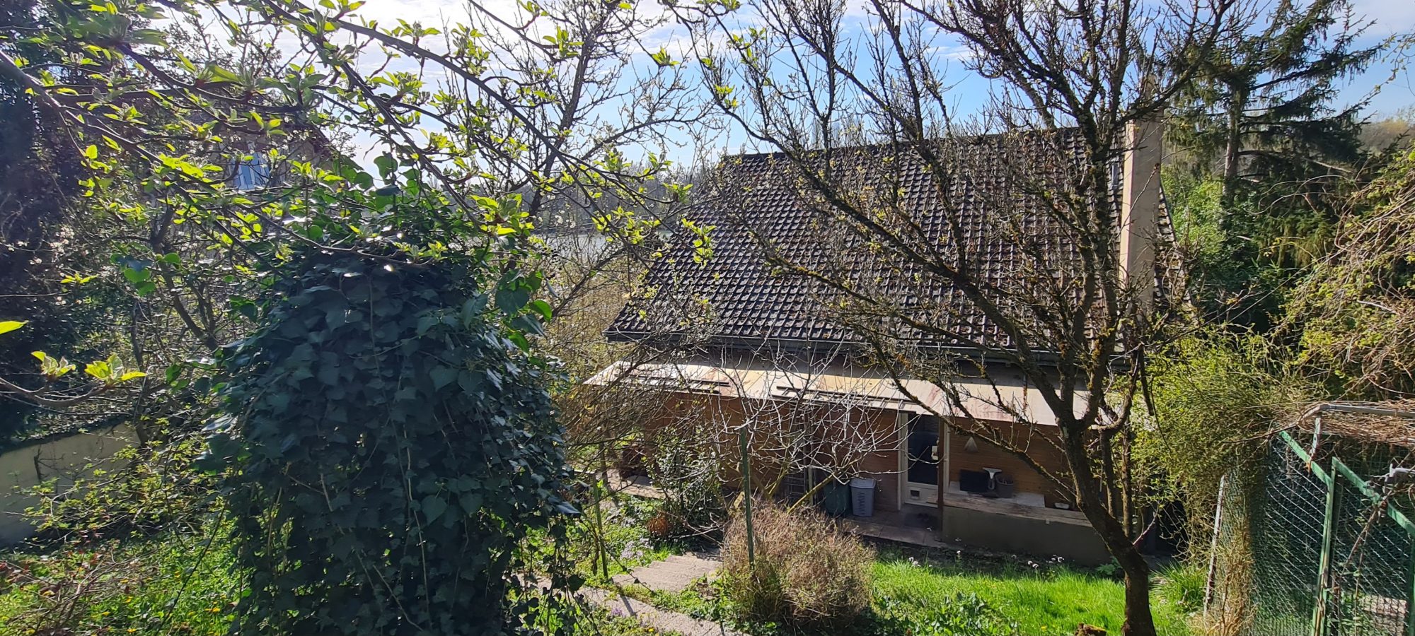 - à l'extérieur: jardin dont une partie en palier à l'arrière de la maison, ancien poulailler, bucher, une servitude de droit de passage pour accéder au bord privé donnant sur la Seine.