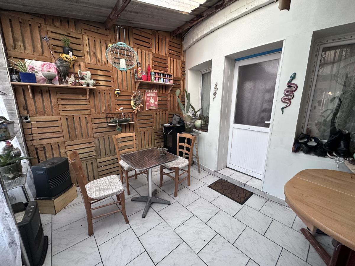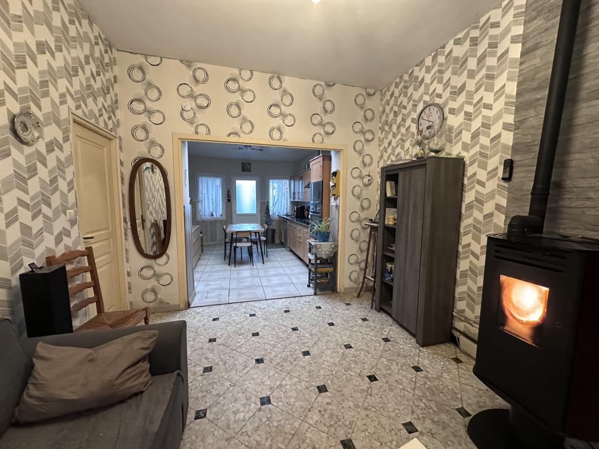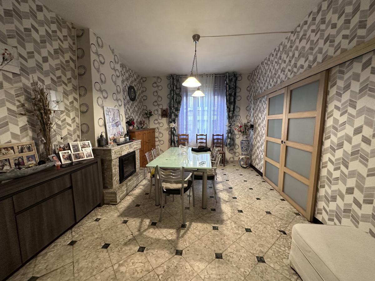 Maison de ville d'environ 140 m² offrant hall, vestiaire, séjour + salon, cuisine équipée, salle de bain, buanderie et WC.