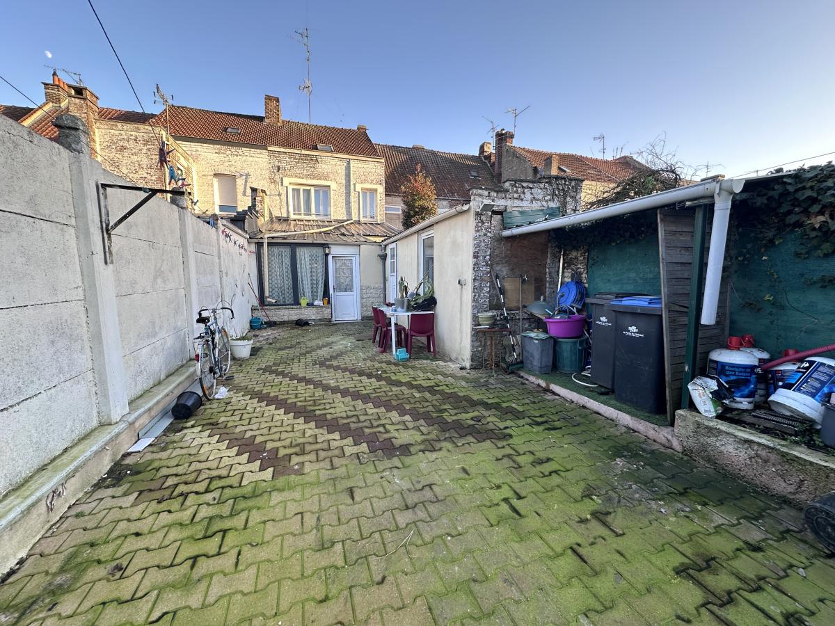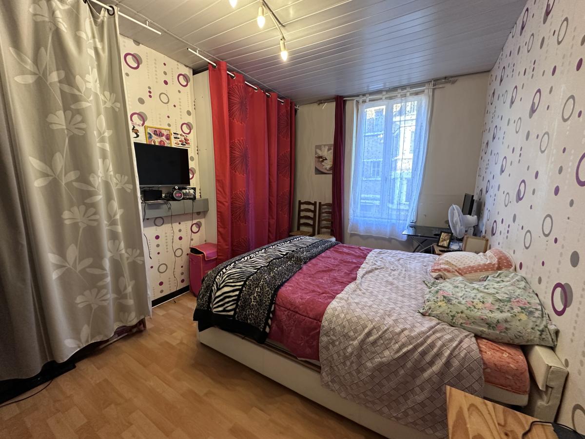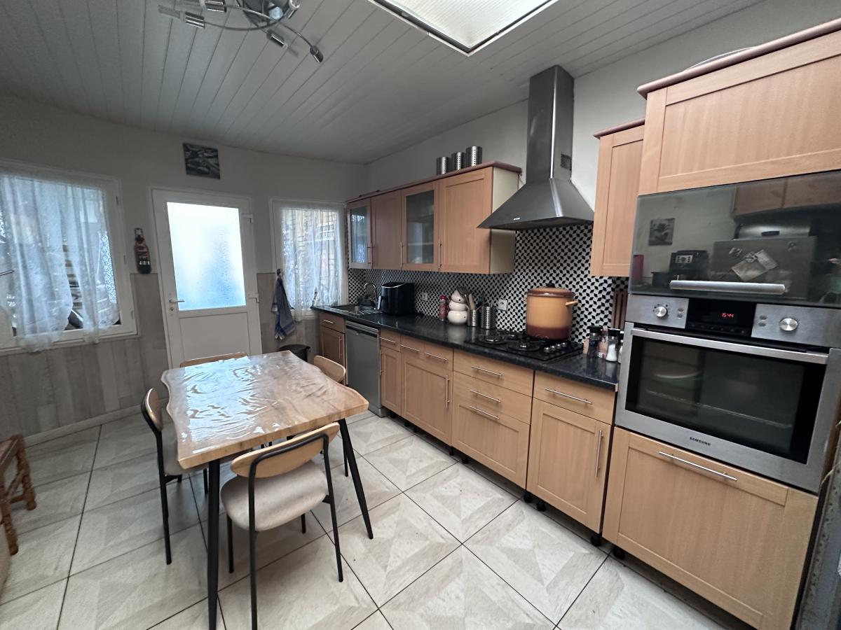 Maison de ville d'environ 140 m² offrant hall, vestiaire, séjour + salon, cuisine équipée, salle de bain, buanderie et WC.