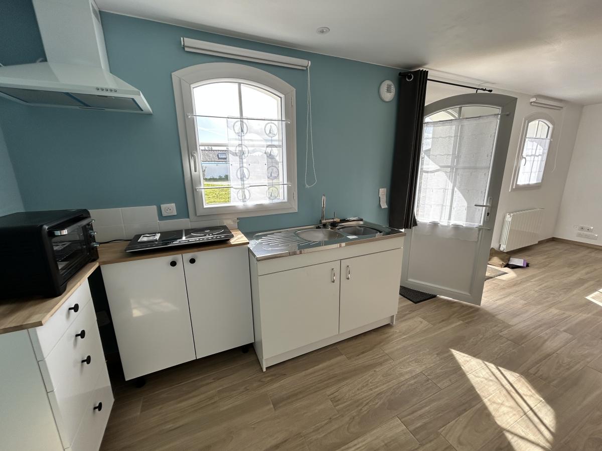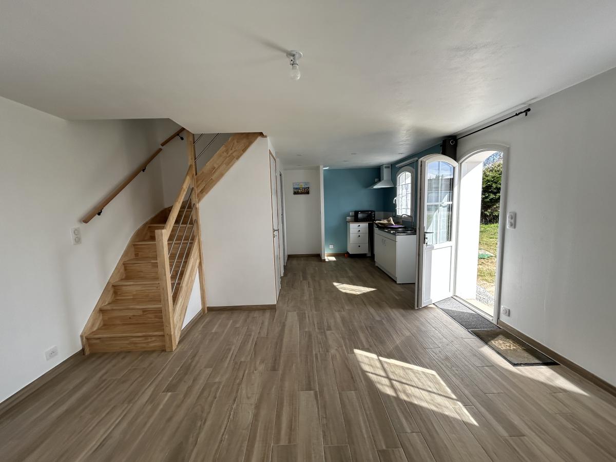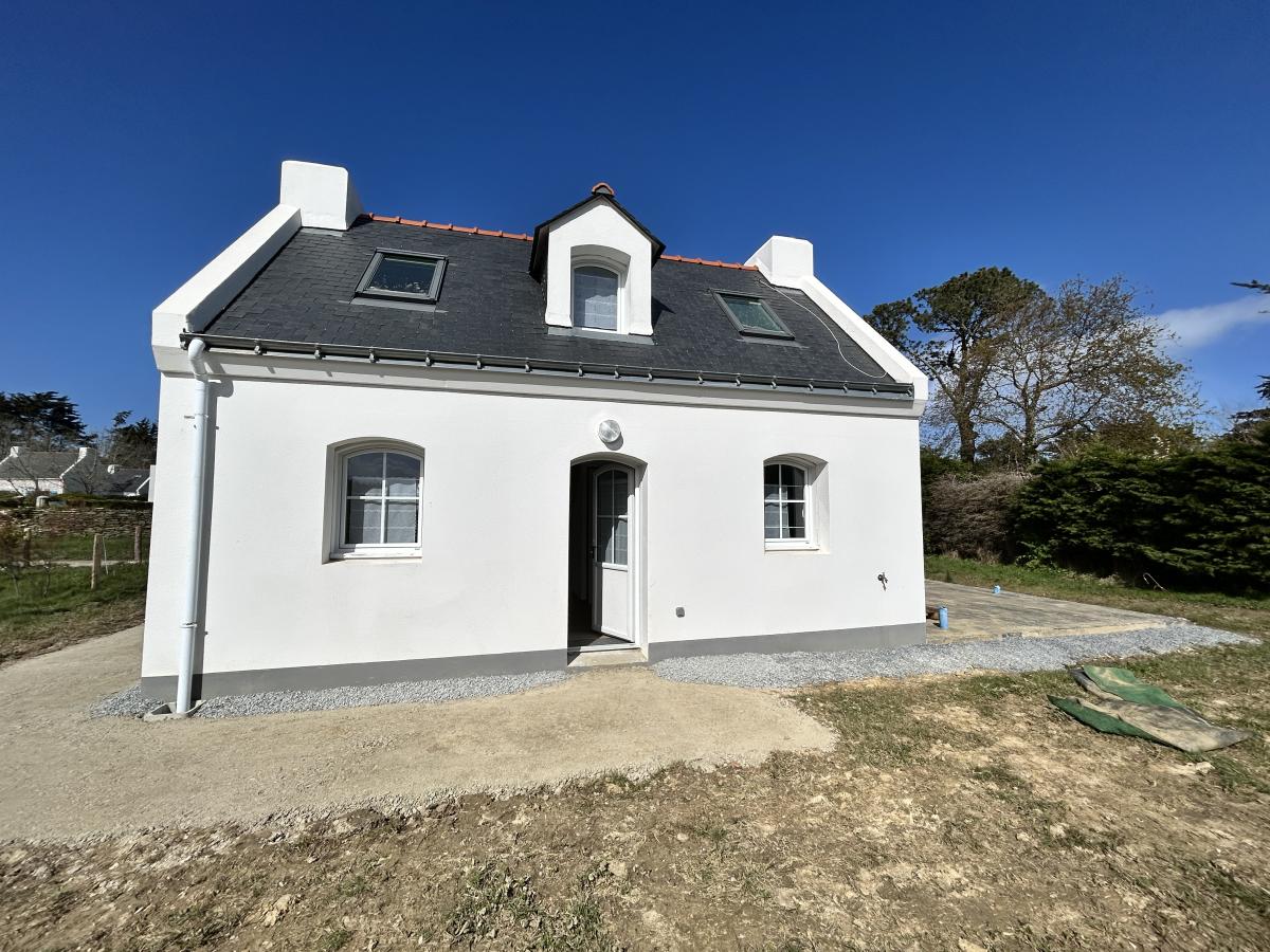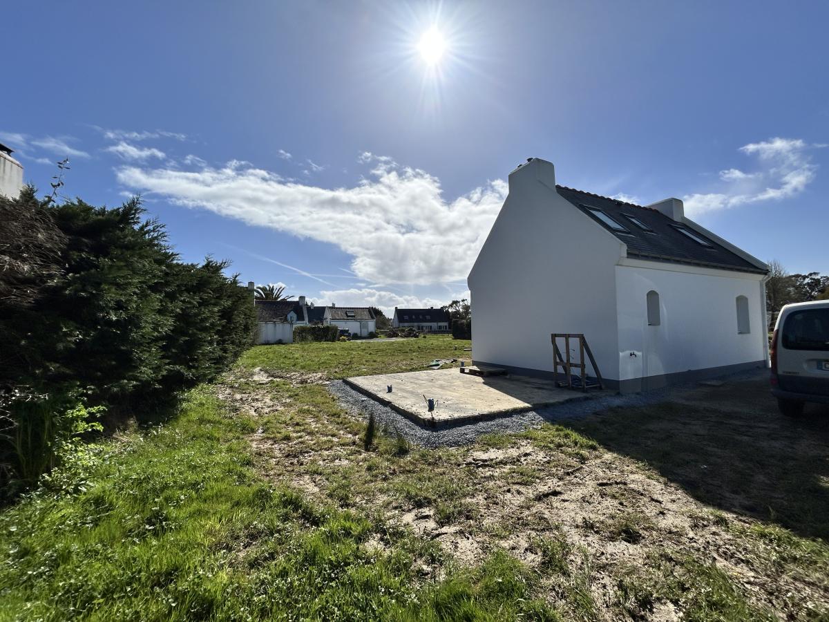 BELLE ILE EN MER - Située dans un hameau au calme, tout en étant à 1 km du bourg de LOCMARIA, maison de 2013 comprenant au rez-de-chaussée : séjour avec coin cuisine ouvert, W.C., salle d'eau. A l'étage: deux chambres, W.C. Permis de construire accordé pour une extension à l'Est de la maison d'une surface plancher de 24m². Jardin. LOCMARIA