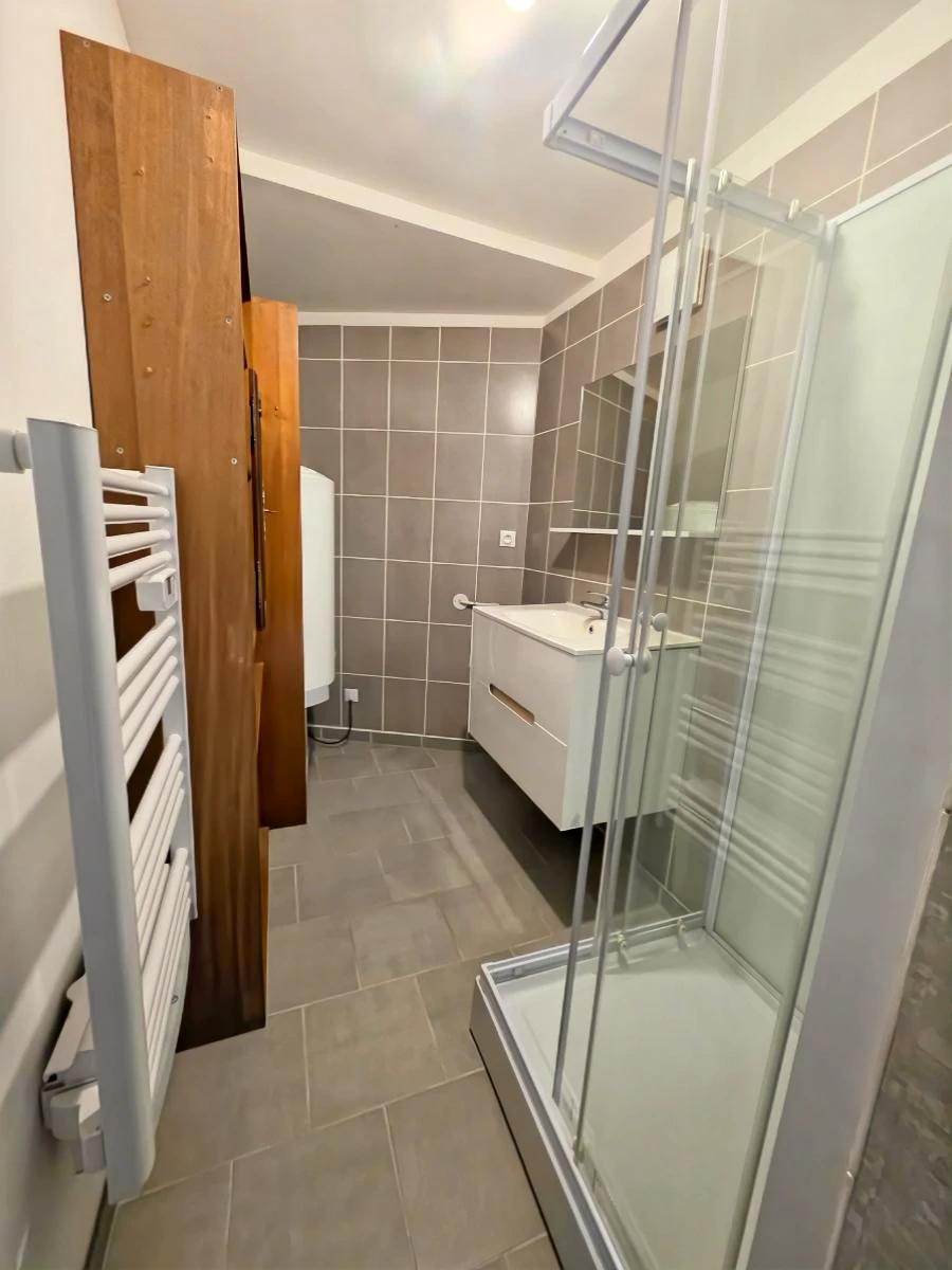 Au rez-de-chaussée : Salon/séjour avec espace cuisine, une chambre, une salle de douche avec coin wc.
