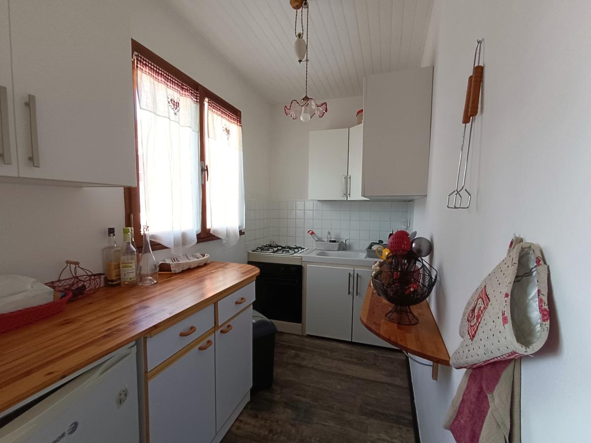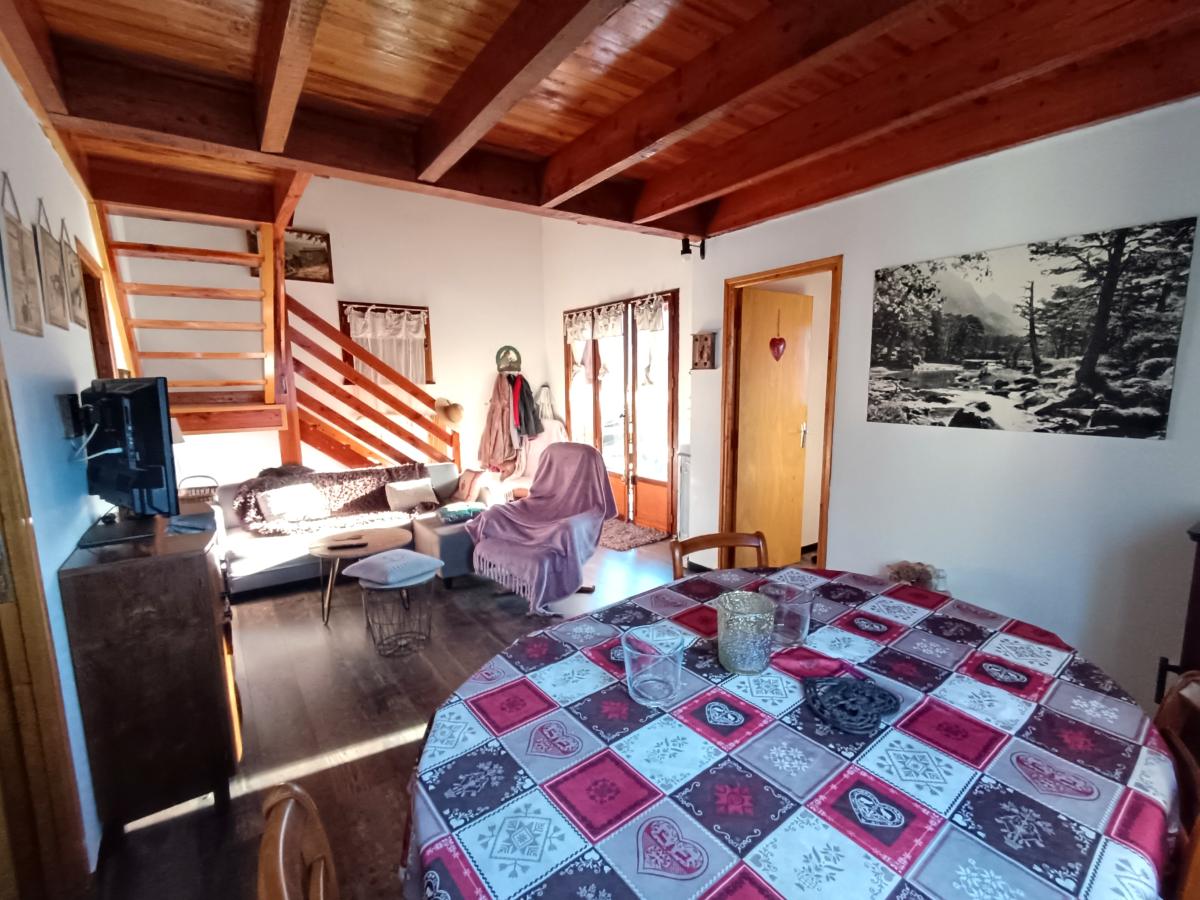 Au 1er étage : la pièce à vivre, deux chambres, un coin cuisine, une salle de bain et un WC