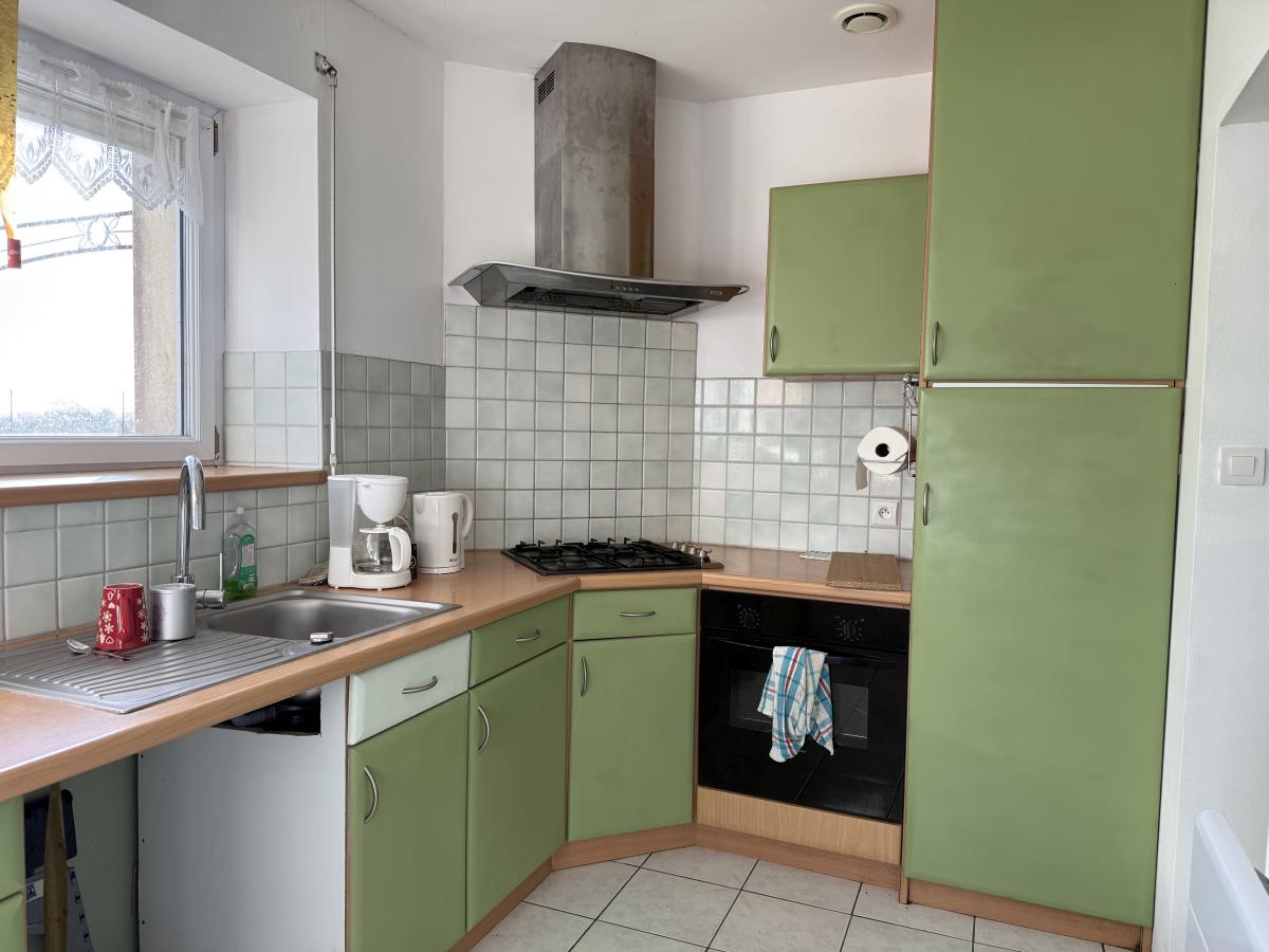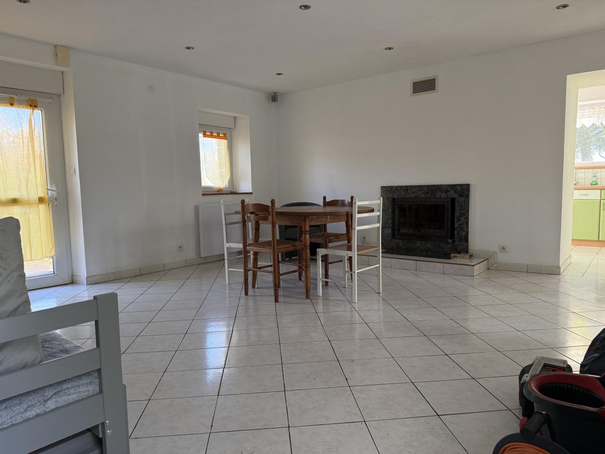 - Au rez-de-chaussée : cuisine, pièce de vie avec cheminée à insert, chambre avec placards, salle de douches, WC.