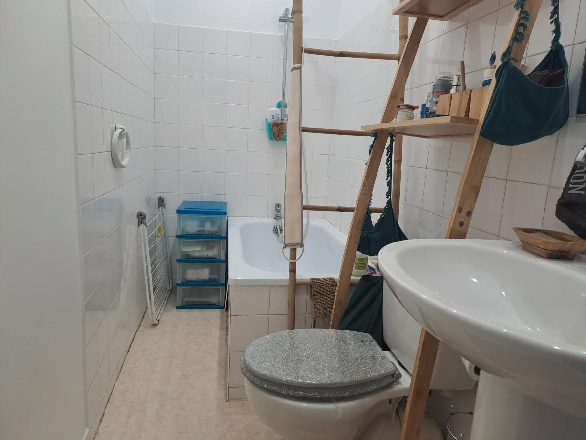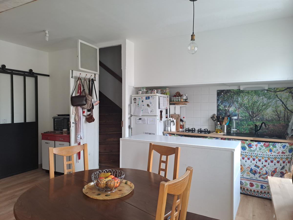 Au premier étage, séjour avec coin cuisine et une salle de bains avec WC.