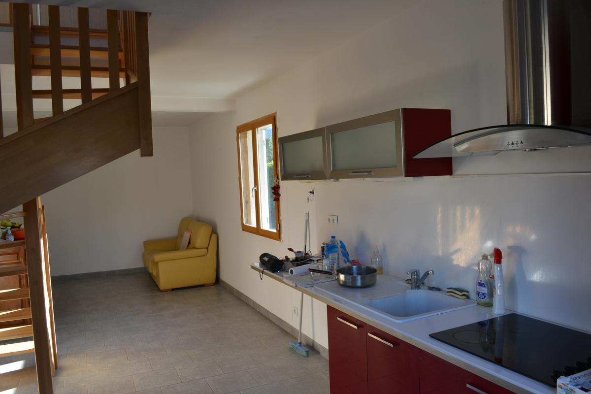 A vendre à Ruoms, Ardèche (07) - Une maison individuelle construite en 2014 avec terrain attenant de 315 m² - Située au cœur du village à proximité des commerces - Chalet en bois - Terrain clos - Tout à l'égout - Surface habitable : 61 m² - Rez-de-chaussée : Hall d'entrée 5 m², Cuisine/Séjour 23,90 m², Chambre 12,30 m², WC indépendant 1 m², Salle d'eau 3,50 m² - Etage : Chambre en mezzanine 15,40 m²