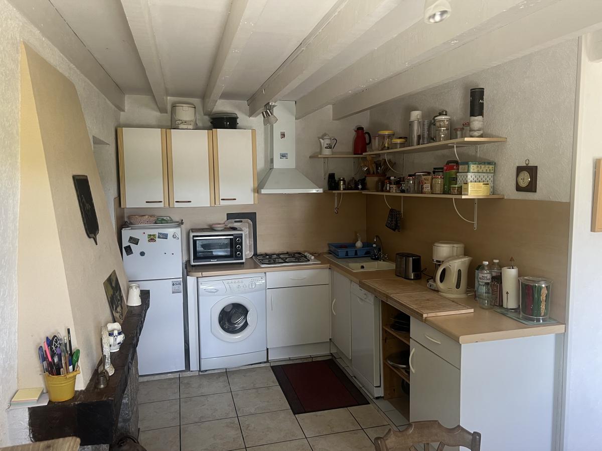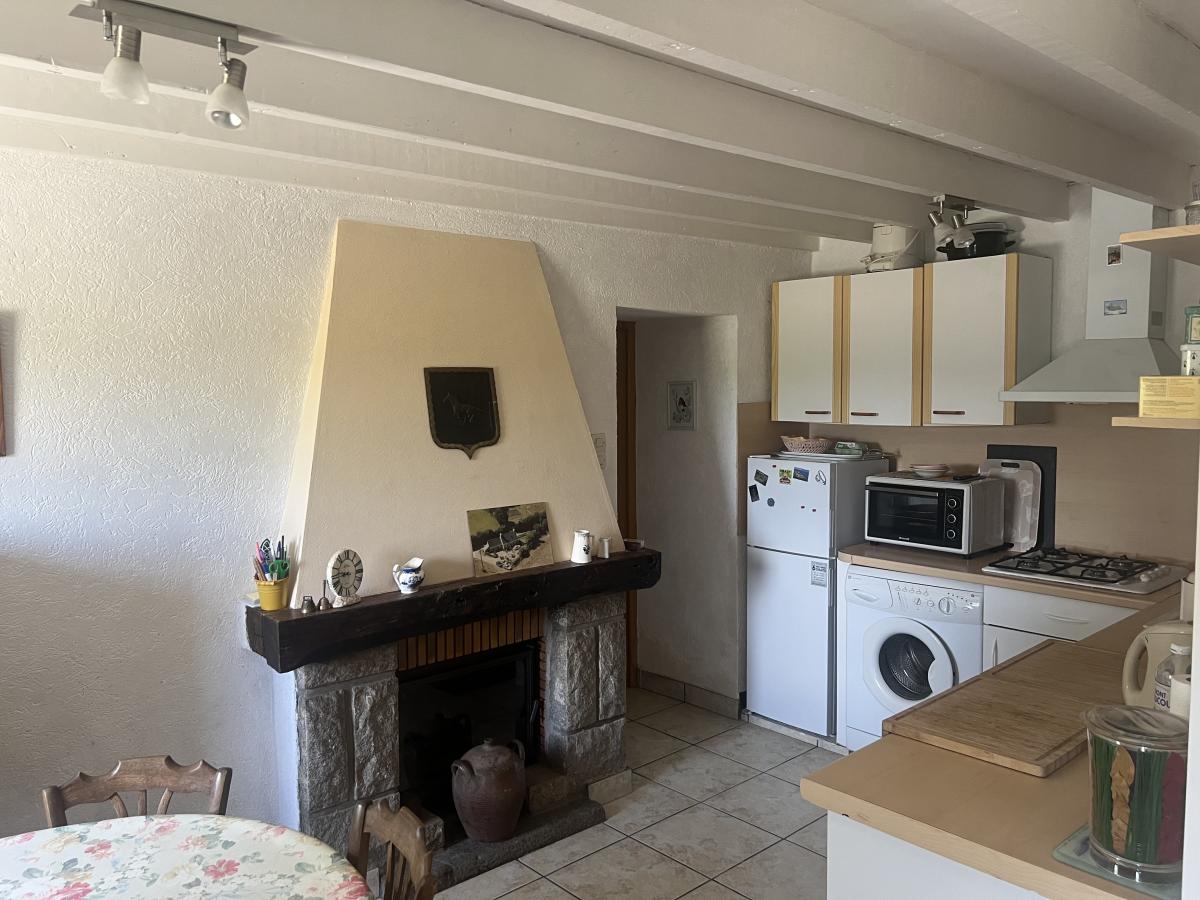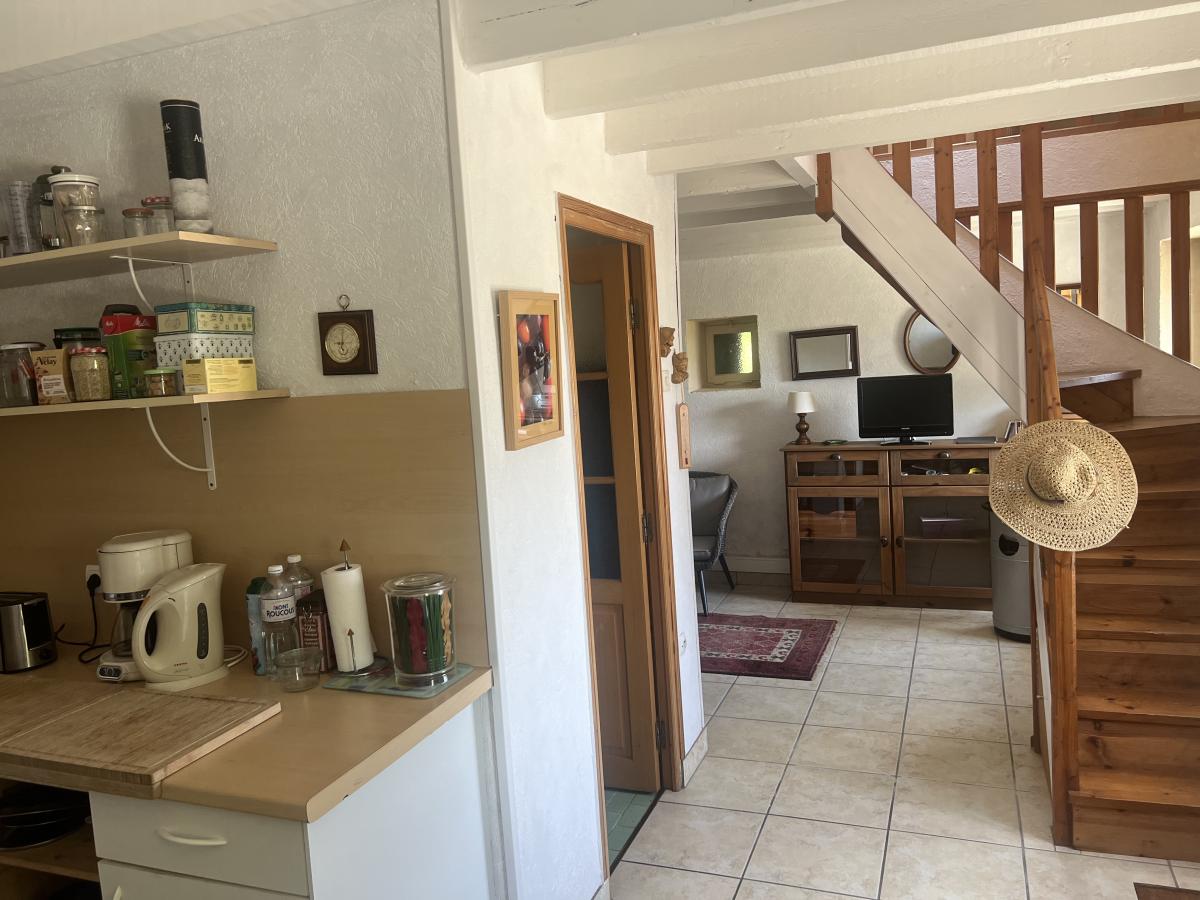 - Au rez-de-chaussée : cuisine avec cheminée à insert, salon/salle à manger, salle de douches avec WC