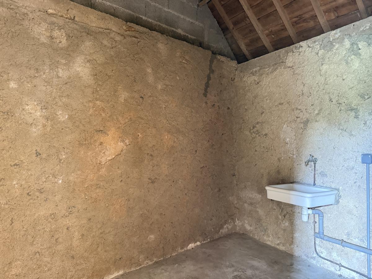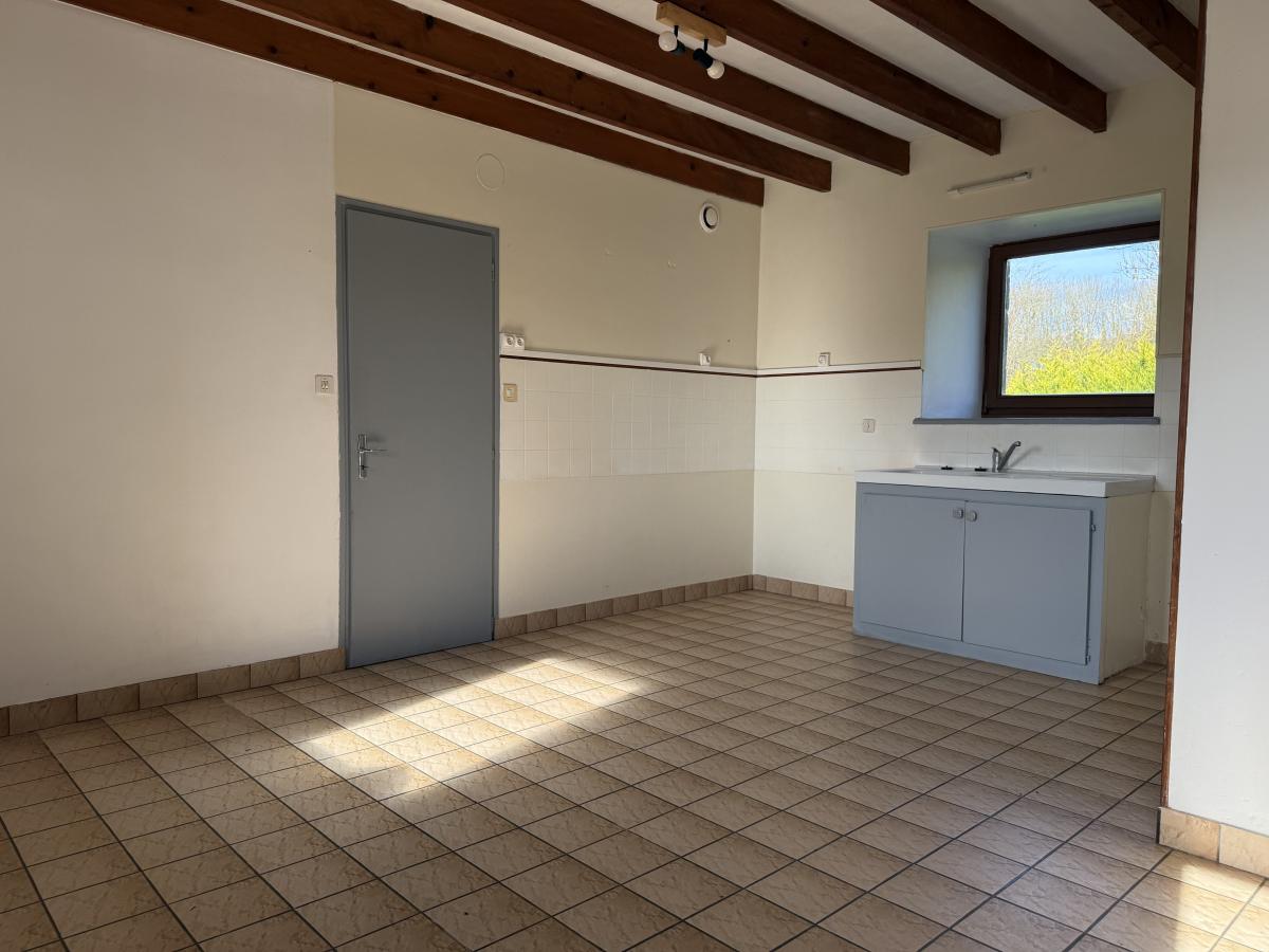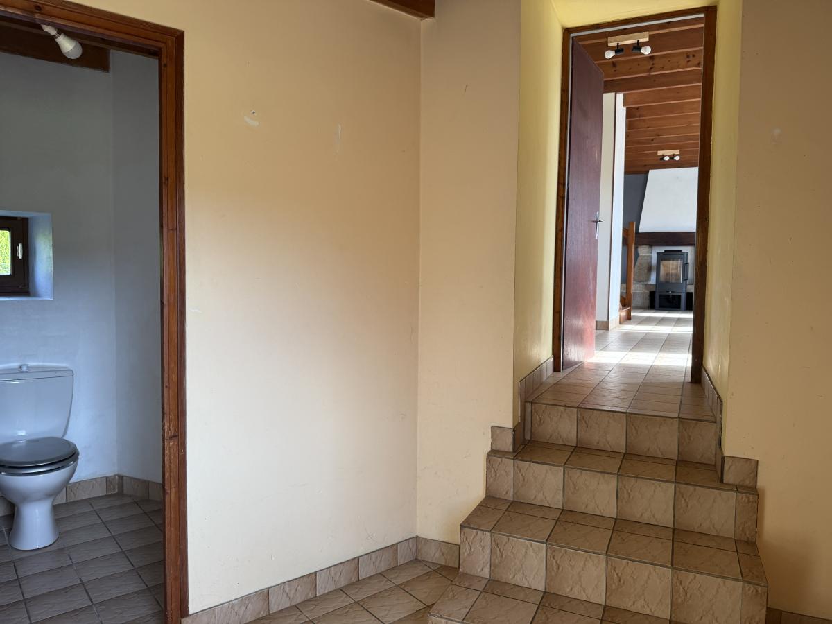 - Au rez-de-chaussée : entrée, salon-séjour avec kitchenette et poêle à bois, WC, buanderie.