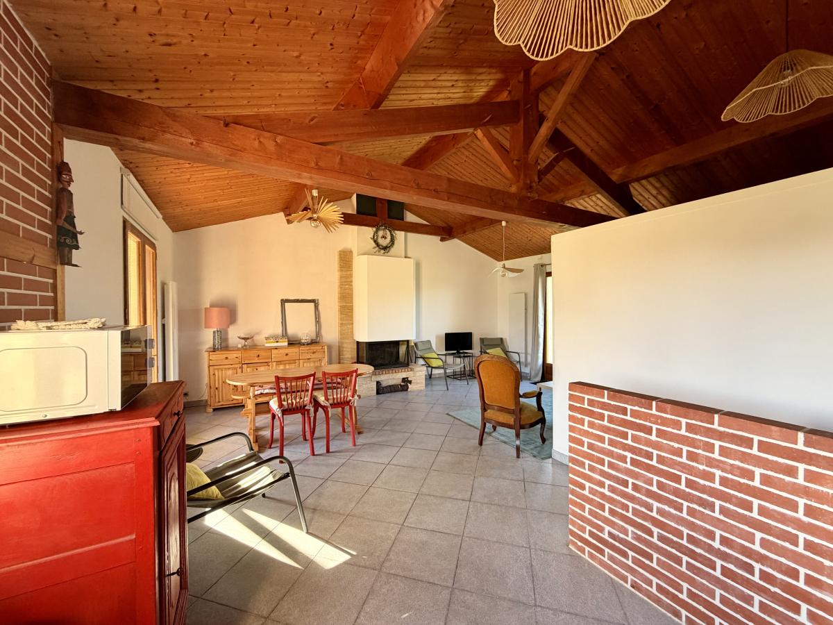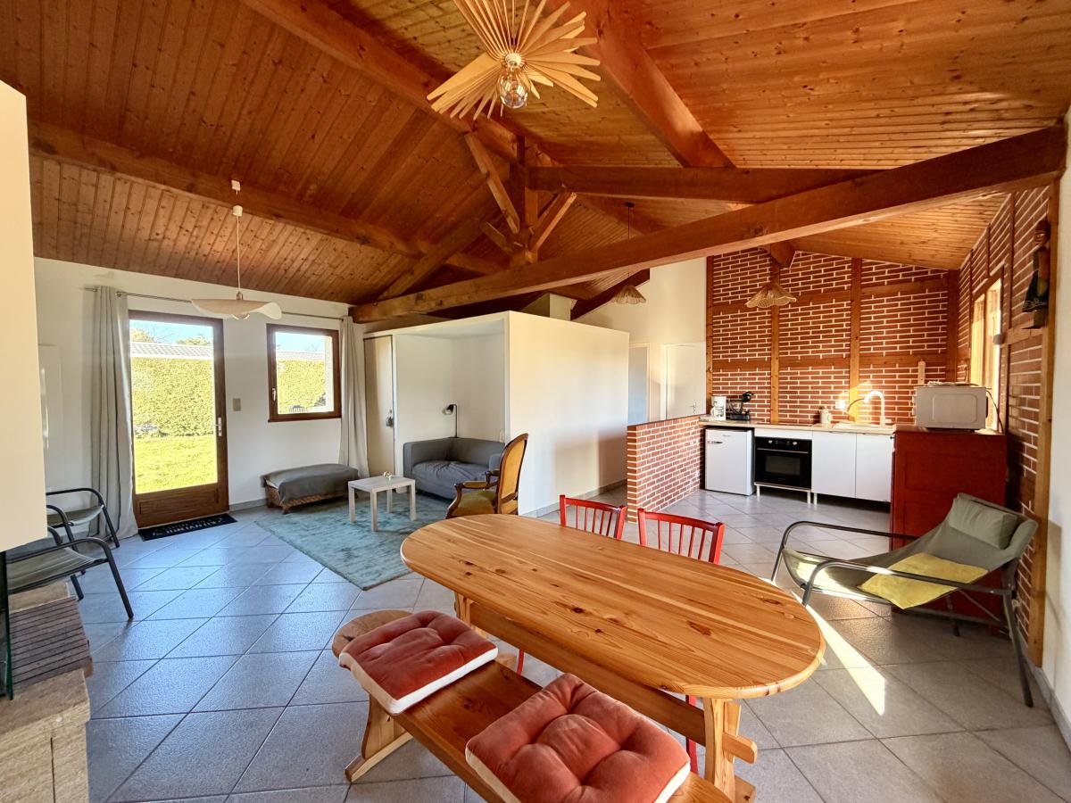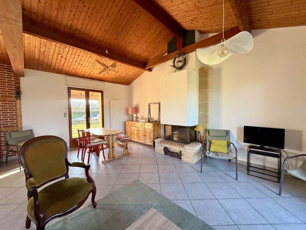 Une entrée directement sur la pièce de vie (salon/salle à manger) avec cheminée et placard, une cuisine ouverte équipée/aménagée, deux chambres, un dégagement, une salle de bains et un W.C séparé.