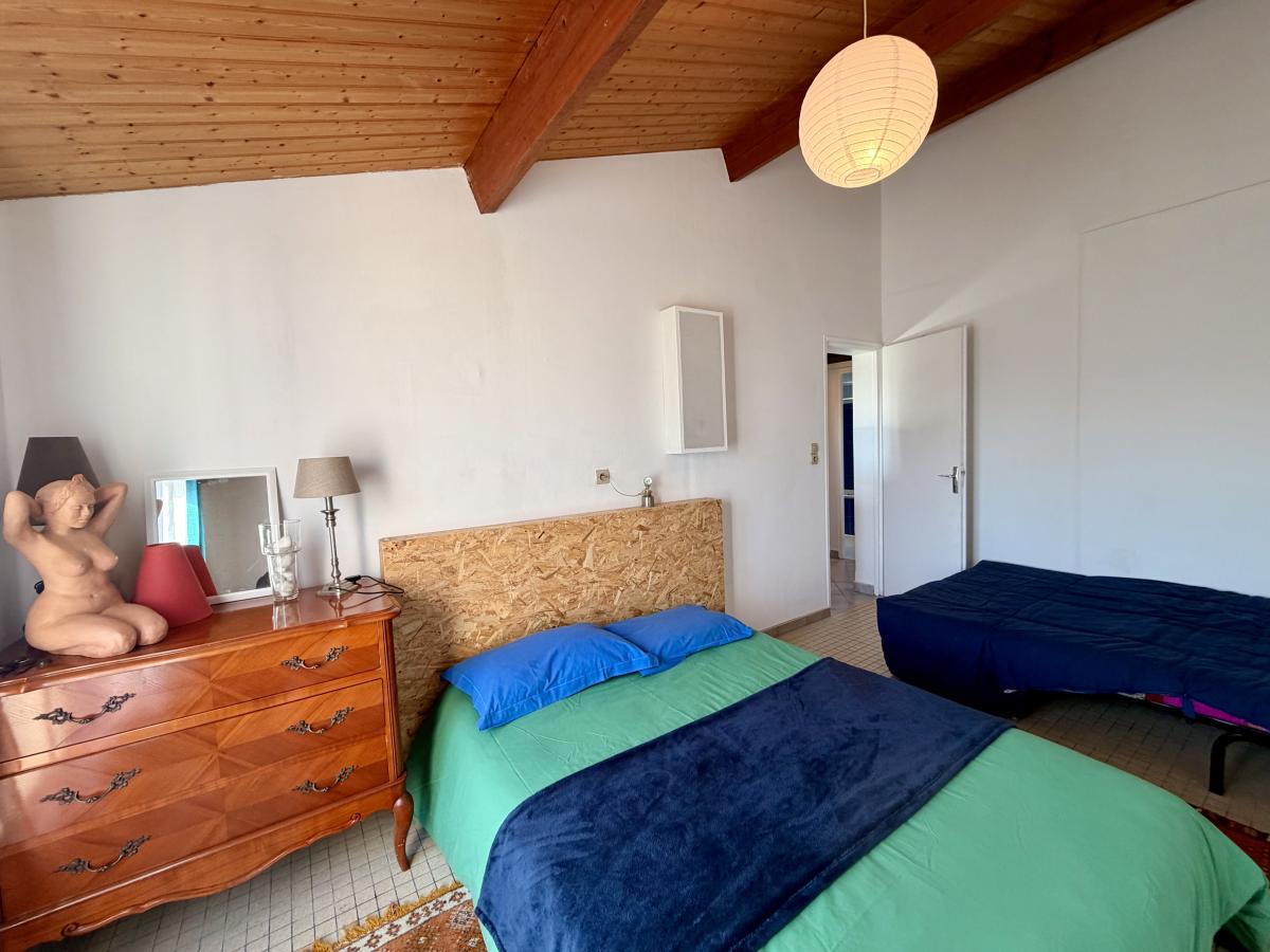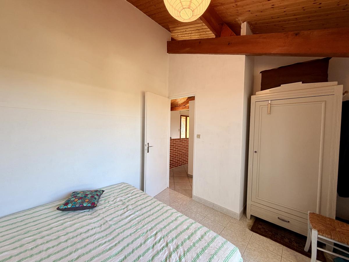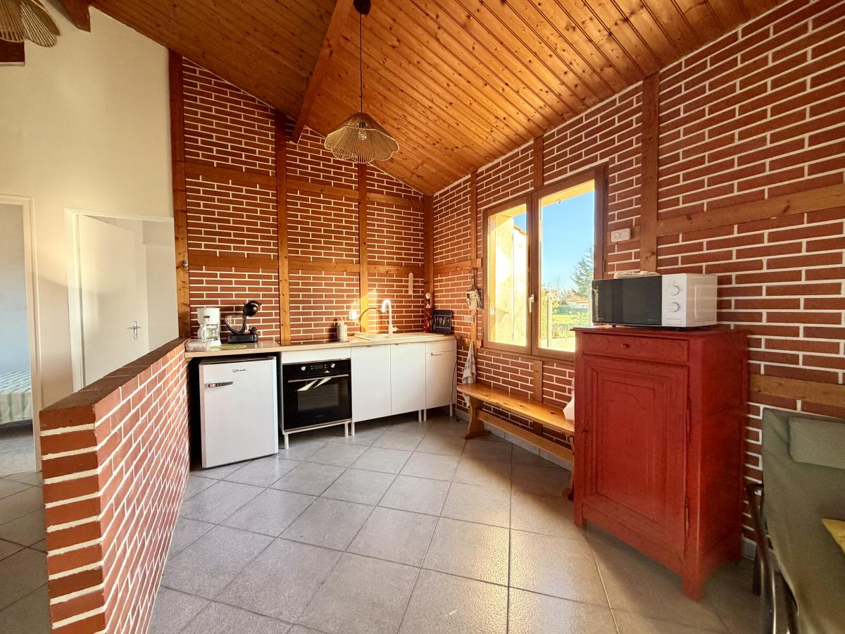 Une entrée directement sur la pièce de vie (salon/salle à manger) avec cheminée et placard, une cuisine ouverte équipée/aménagée, deux chambres, un dégagement, une salle de bains et un W.C séparé.