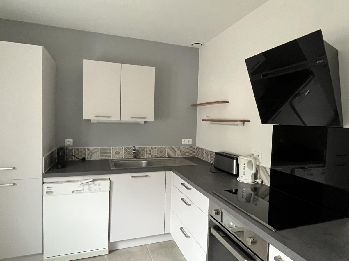 Pièce à vivre avec cuisine équipée, porte fenêtre sur terrasse, dégagement, deux chambres, slle d'eau, wc.
