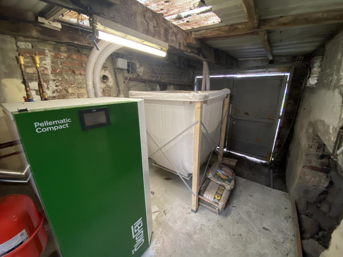 A l'extérieur, jardin avec parcelle engazonnée, dépendances (toiture Fibrociment) avec chaudière à granulés (et ancienne cuve). Le tout clos de murs, de palissades béton et grillage.
