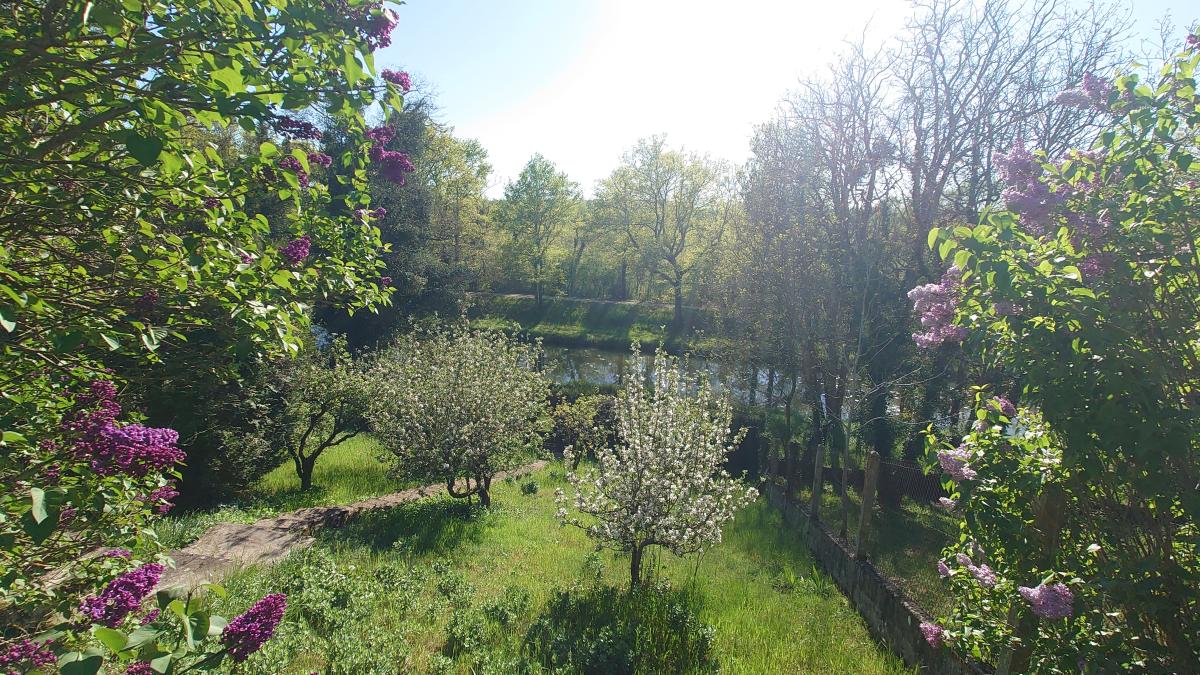 Terrain clos et arboré avec accès au canal, autre bâtiment à usage de remise de jardin, atelier et cave.
