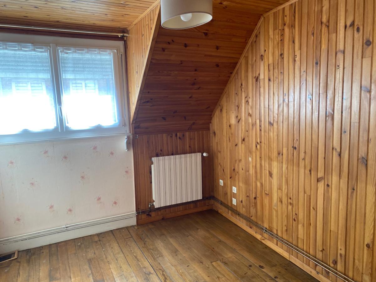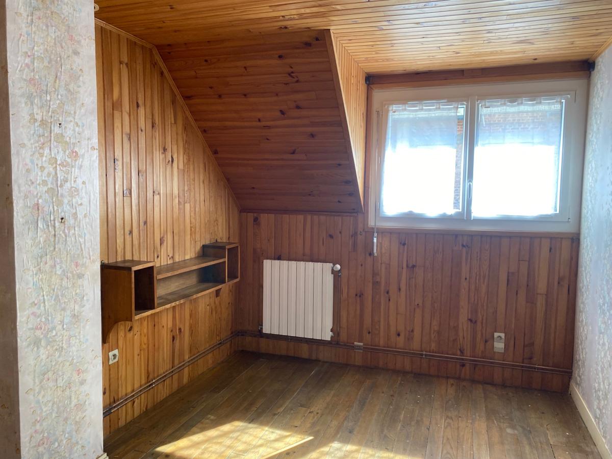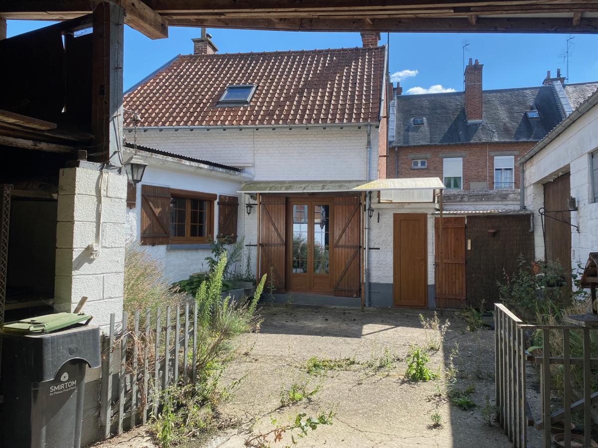 Maison à vendre à DOULLENS, centre ville sur 331m² avec dépendances (71 m² habitables) comprenant séjour (32m²), cuisine (8,50m²) et salle de bains avec une vasque et douche (6,90m²). Etage : palier (5,40m²) et deux chambres (9+9,50m²). Garage, cour et dépendances en dur, cave avec chaudière (gaz de ville).