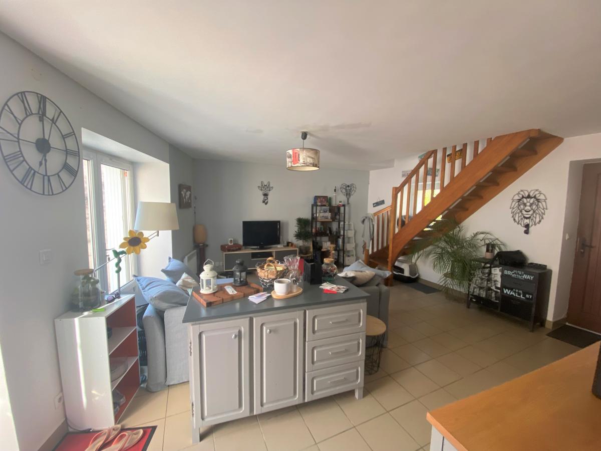 Située dans le bourg de MONNIERES, au calme, maison d'habitation à étage libre de toute occupation comprenant au rez-de-chaussée : une pièce de vie avec cuisine ouverte, un WC et une lingerie. A l'étage : un palier avec placard, deux chambres et une salle de bains.