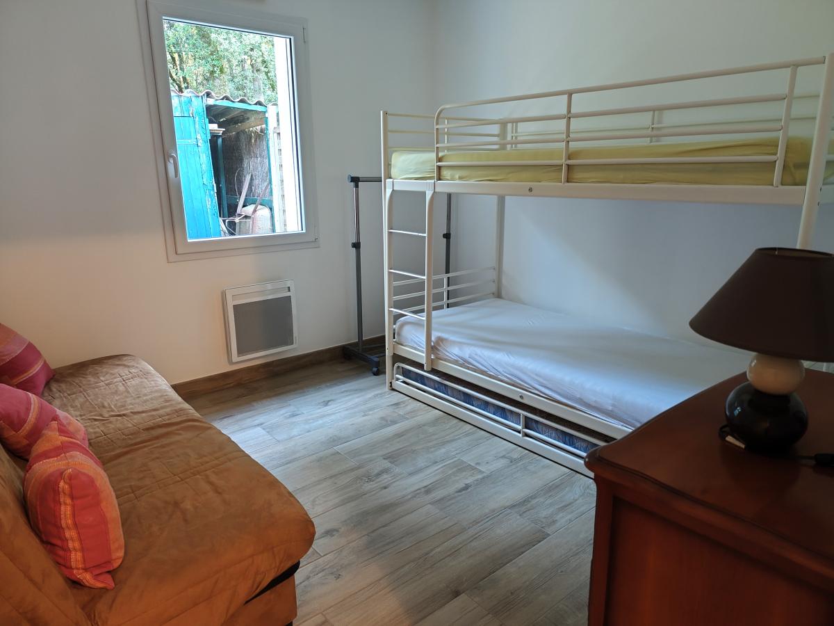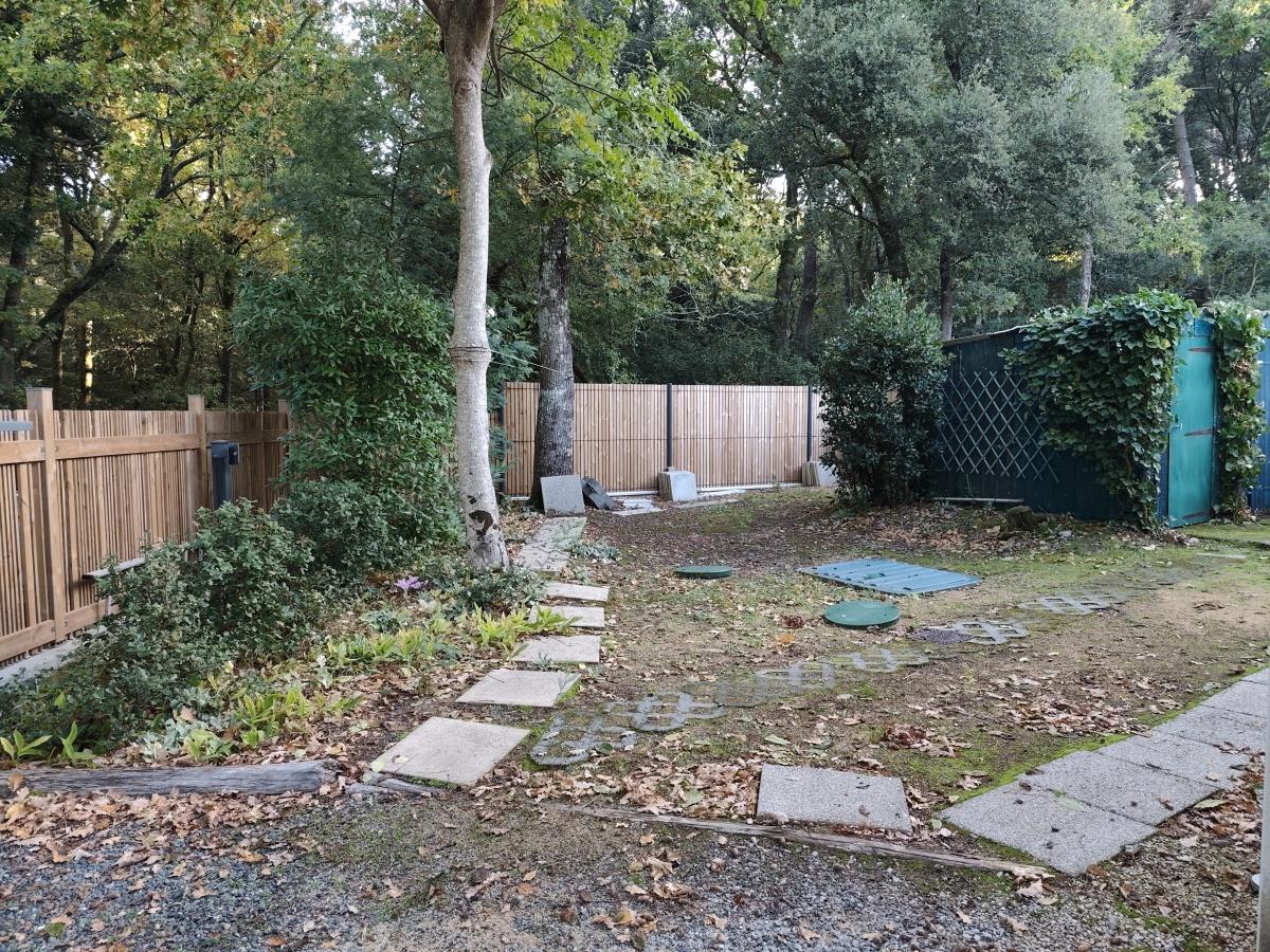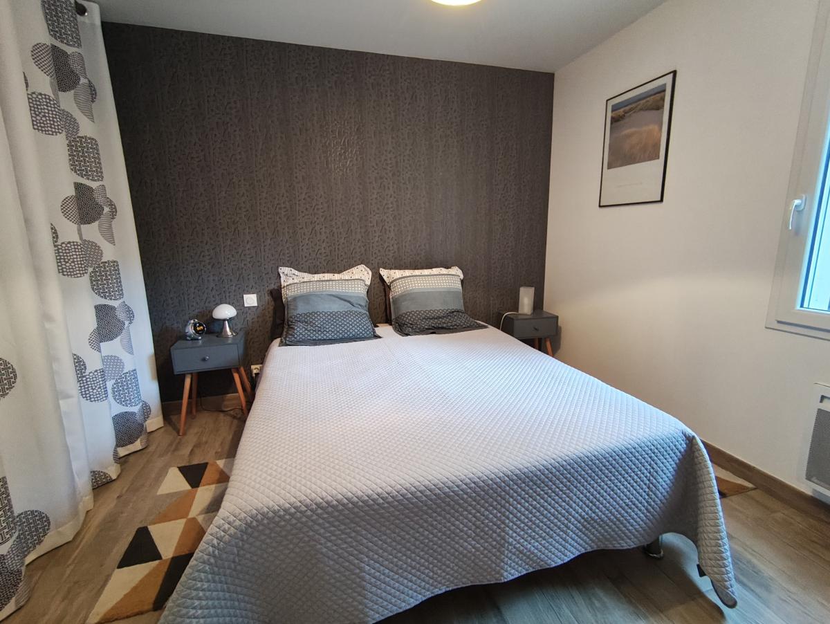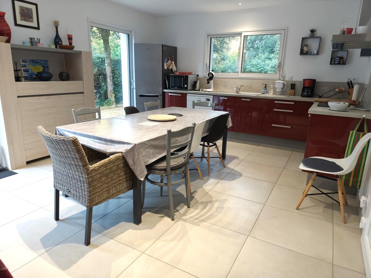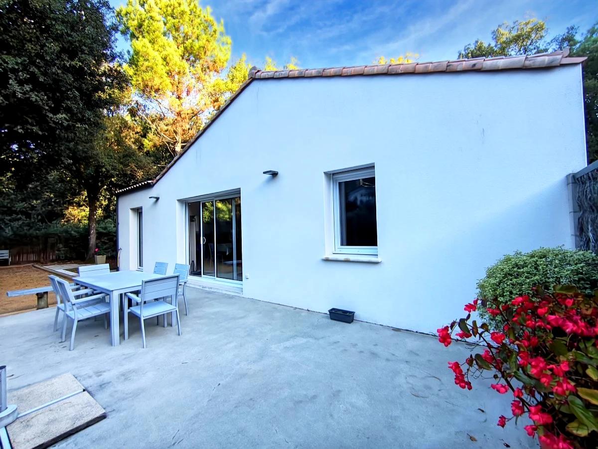 A 800 mètres de la mer, dans environnement boisé, maison de plain-pied bâtie en 2017 comprenant : salon-séjour, cuisine ouverte aménagée et équipée donnant sur terrasse de 31 m² exposée Sud, dégagement avec placard donnant sur WC, dégagement avec placard desservant deux chambres dont une avec grand placard et salle d'eau.