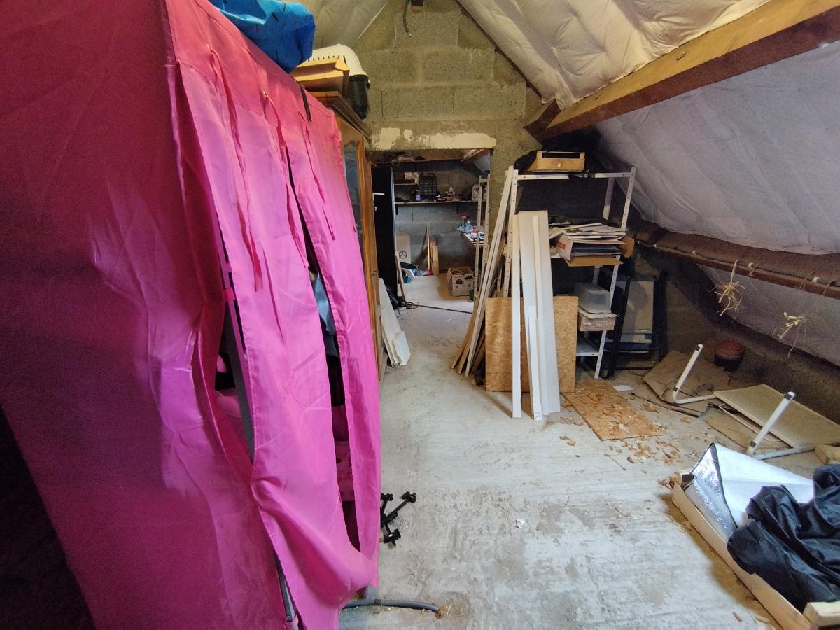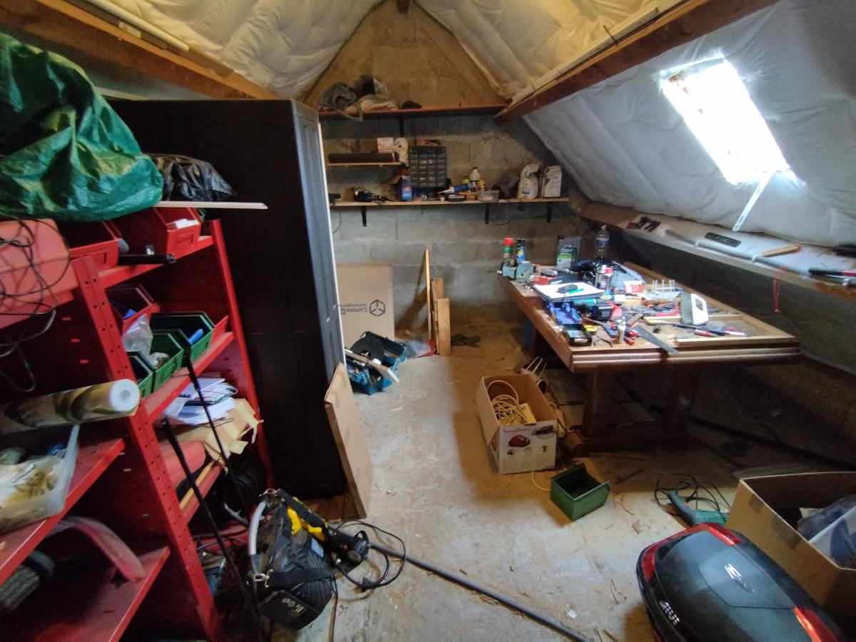 À l’étage, un palier dessert une chambre, une salle de bains, un WC indépendant et un grenier, offrant un espace de rangement supplémentaire ou un potentiel d’aménagement selon vos projets (bureau, chambre, dressing…).