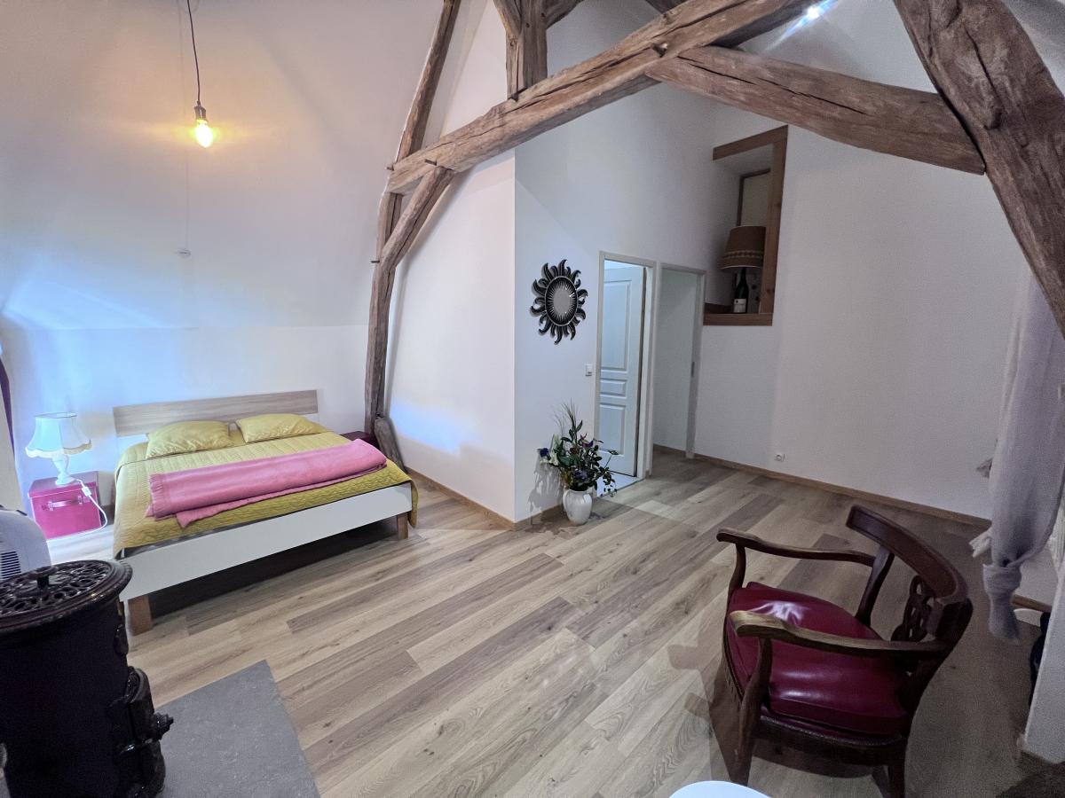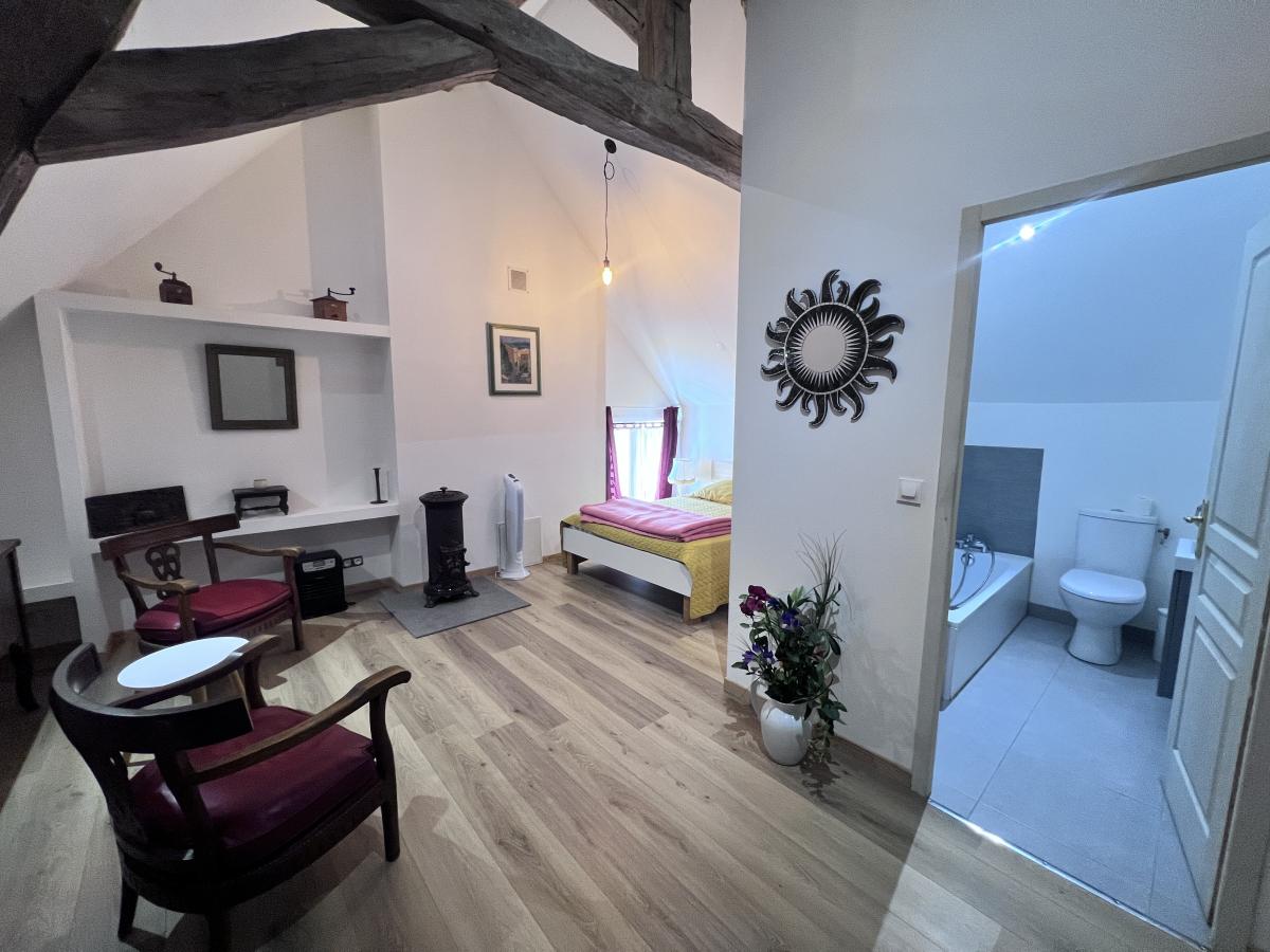 Rez-de-chaussée : Entrée, cuisine aménagée/équipée ouverte sur la salle à manger, salon cosy avec poêle à bois, une grande chambre, une salle d'eau et un WC séparé.