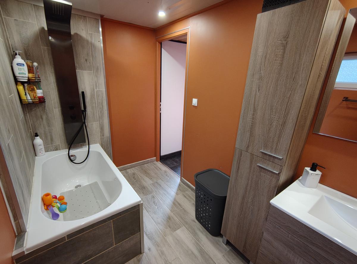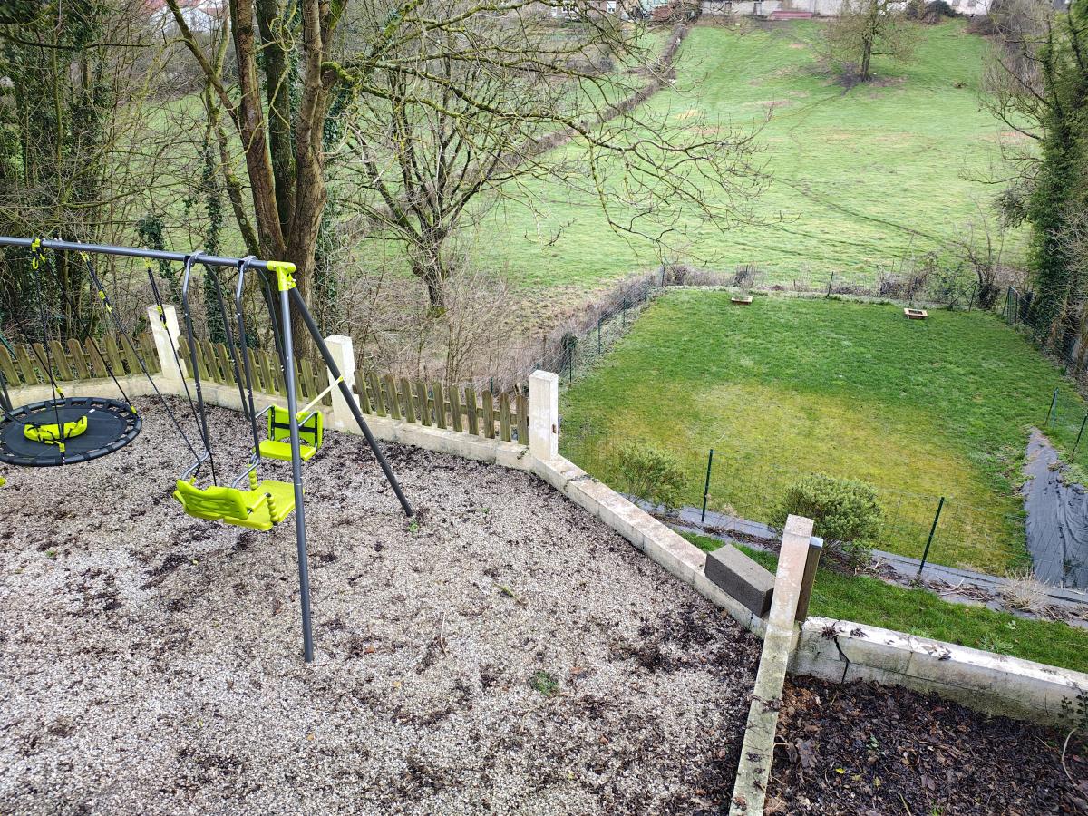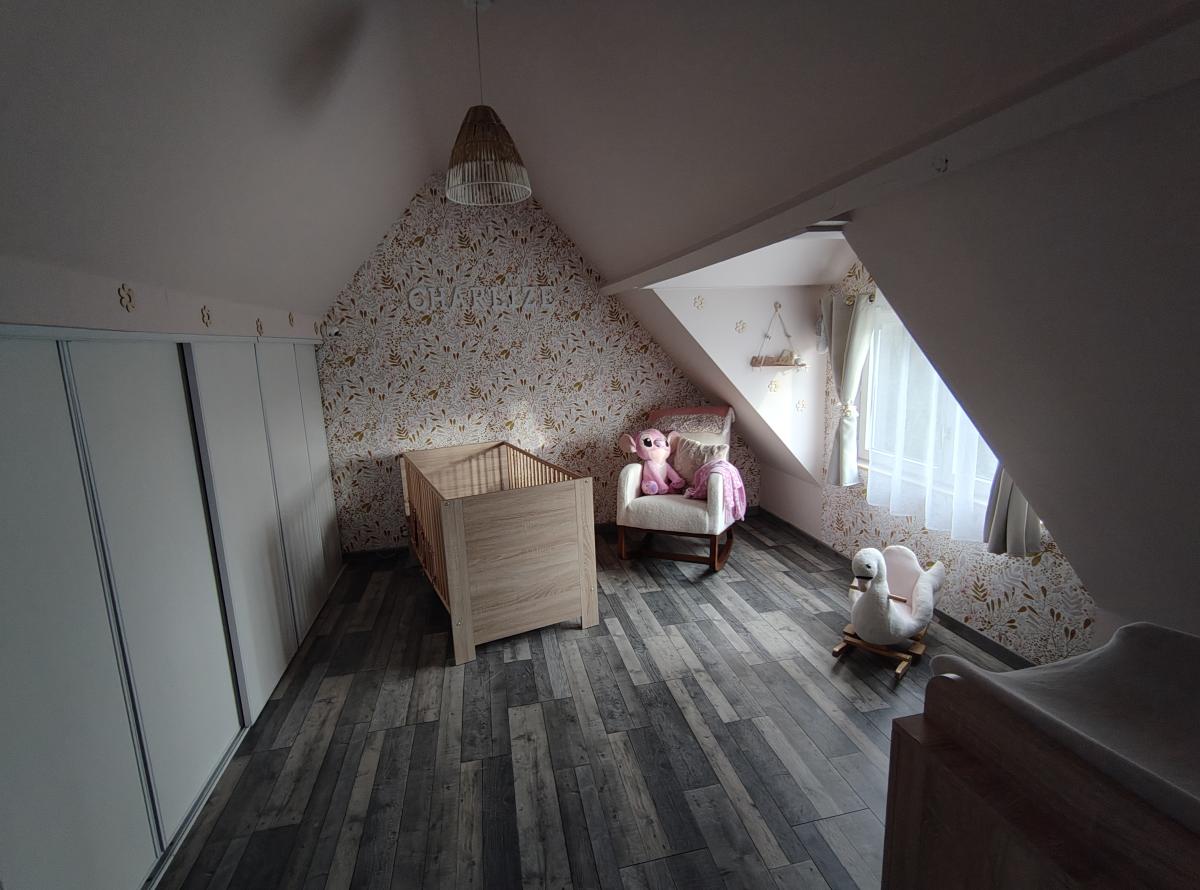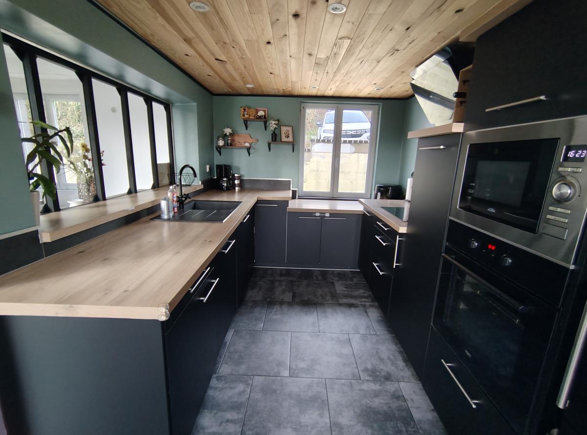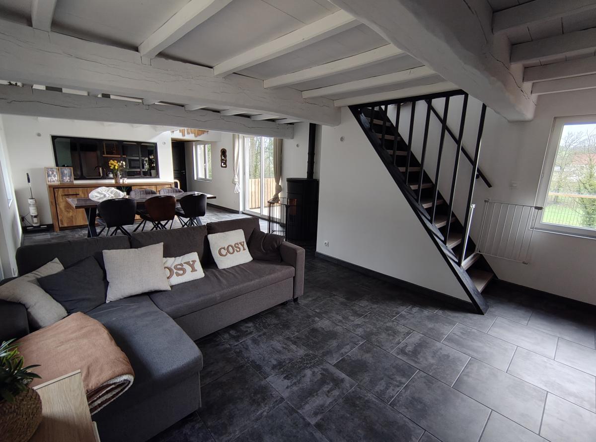 - Au rez-de-chaussée : salon/séjour de 36,85 m² avec poêle, cuisine aménagée et équipée, salle de bains et WC.