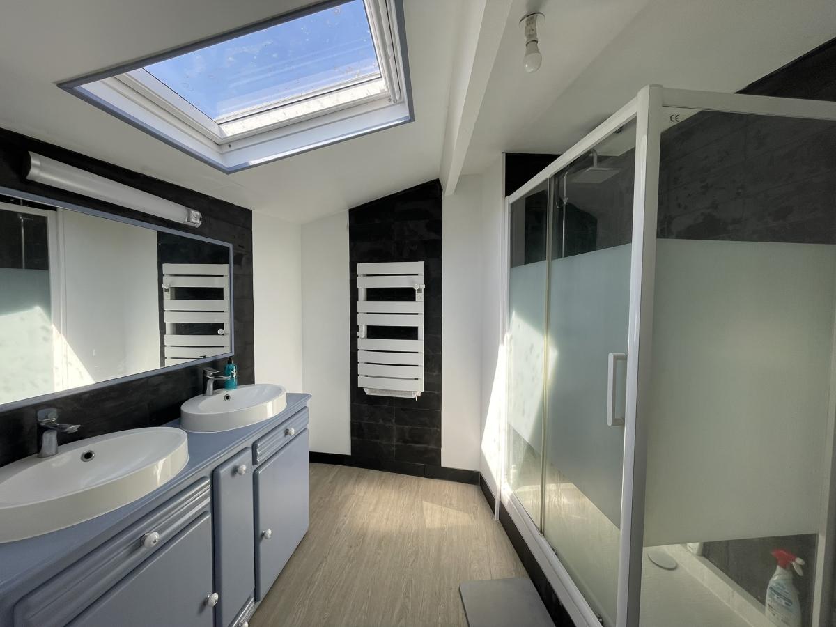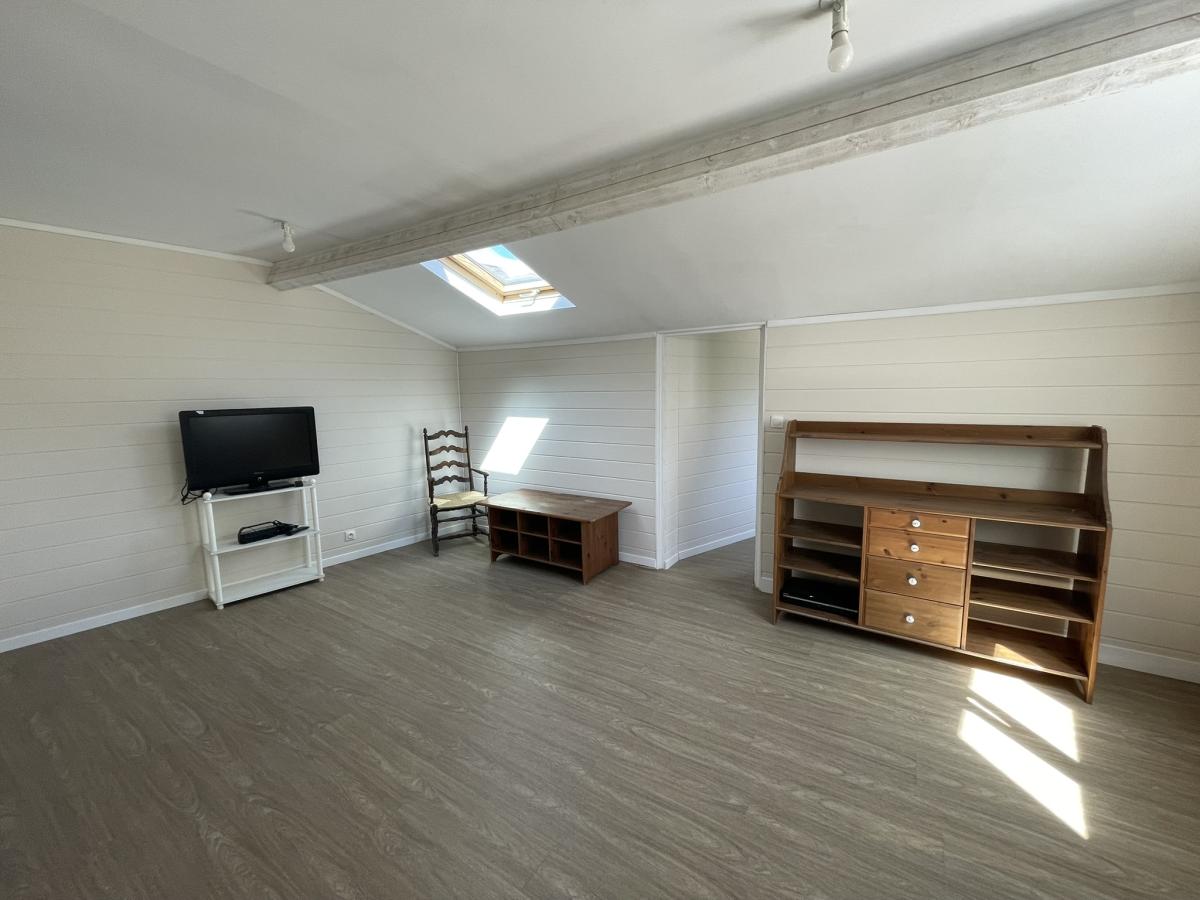 Maison ancienne rénovée offrant au rez-de-chaussée : entrée, cuisine aménagée/équipée, salon/séjour, WC, salle d'eau, bureau et chambre ; à l'étage : une chambre.