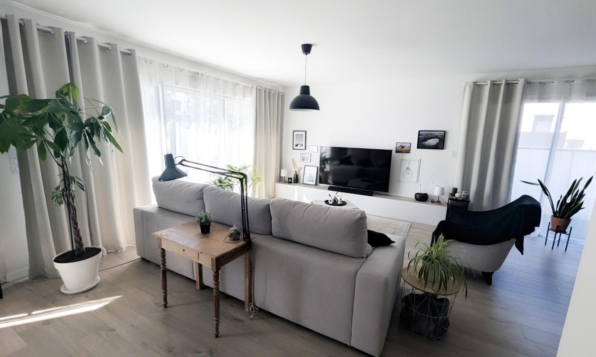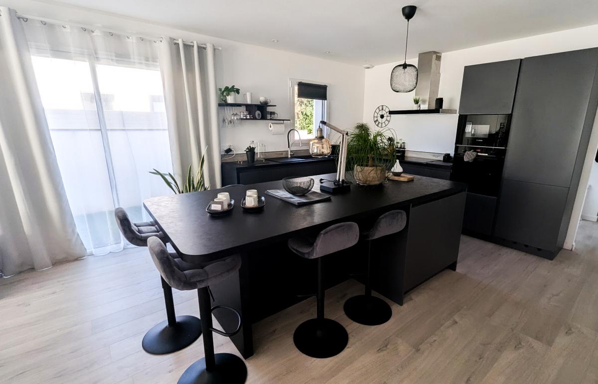 Entrée, vaste pièce de vie avec cuisine ouverte aménagée et équipée, salon et salle à manger.