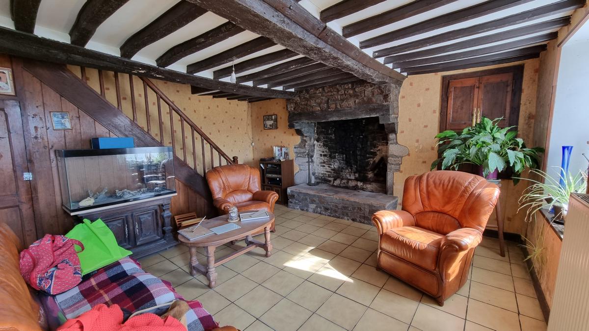 Au rez-de-chaussée : cuisine, salle de bains, wc, salle, salon avec cheminée.