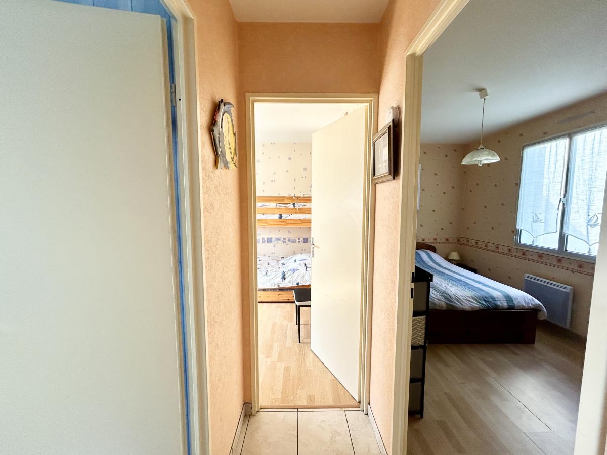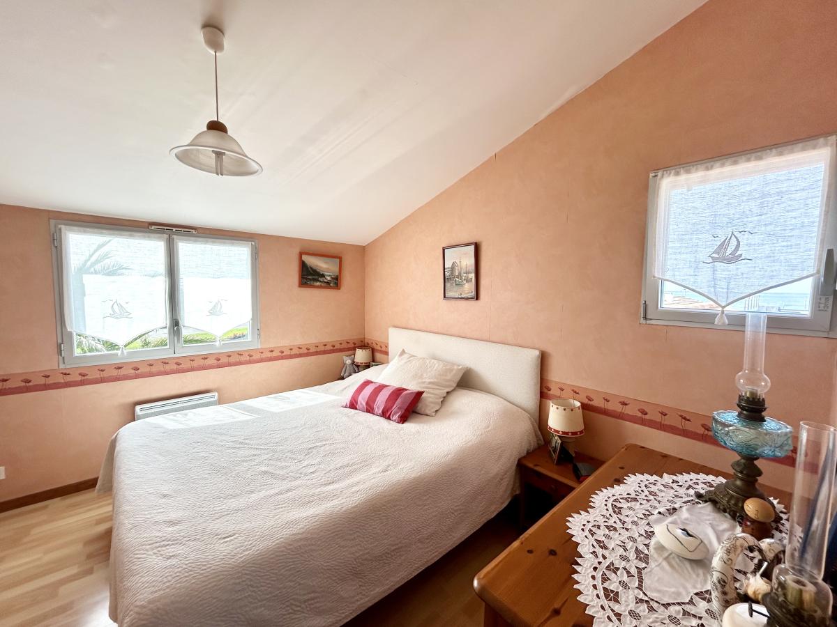 À l’étage : un palier, une chambre avec placard et vue mer, une salle de bains et un W.C séparé.