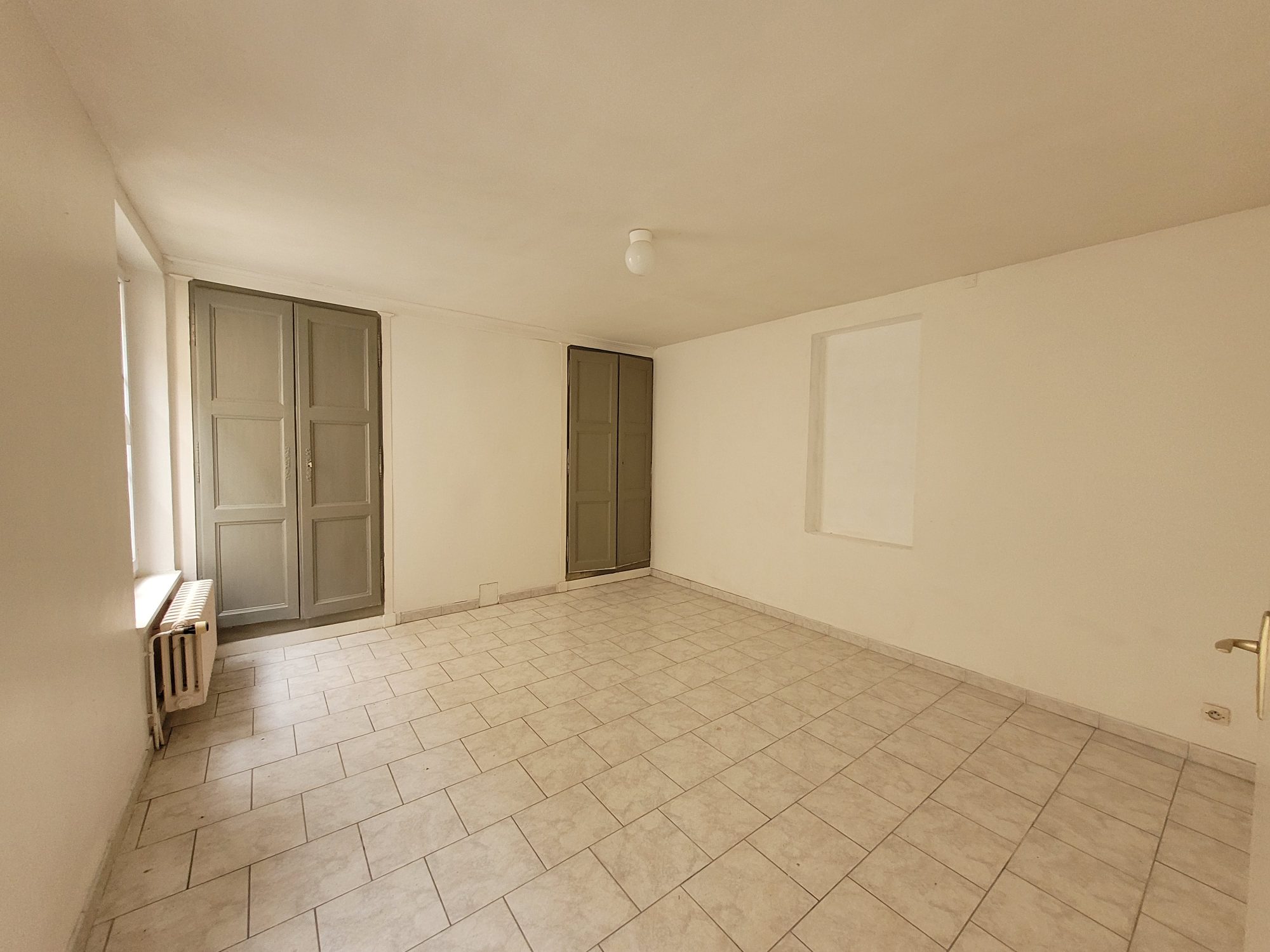 Au 1er étage : palier, chambre avec placards et future salle d’eau.