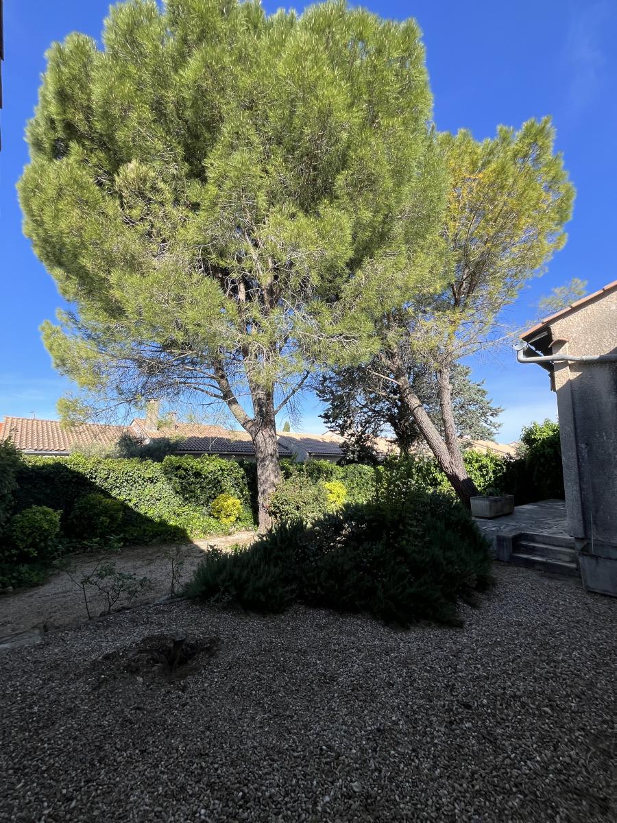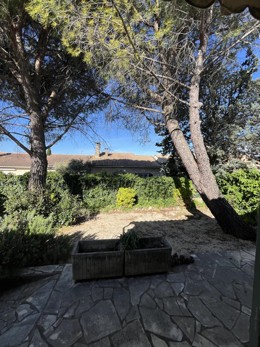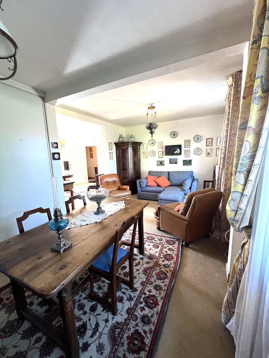 Le salon séjour, lumineux et convivial, s’ouvre sur une grande terrasse et un jardin ombragé par un majestueux pin, offrant un cadre idéal pour les moments de détente en plein air.
