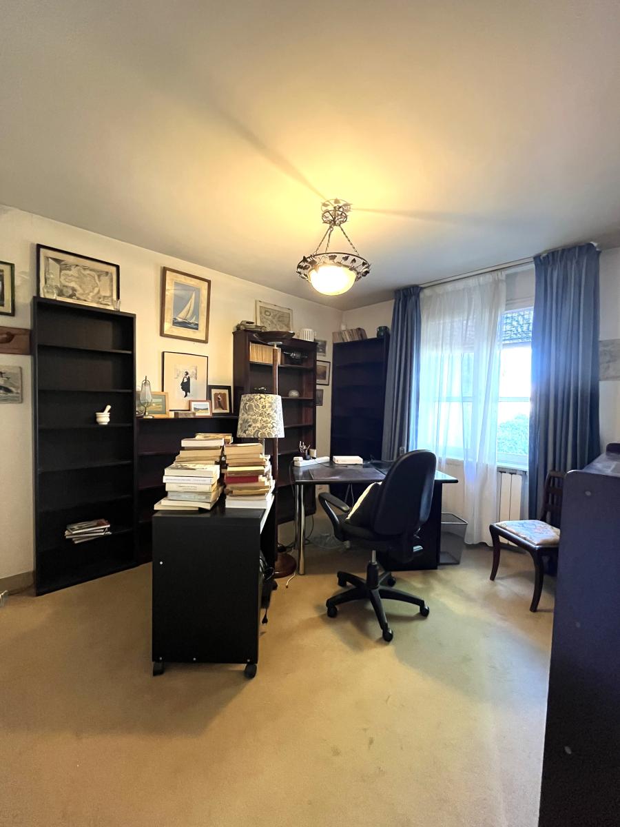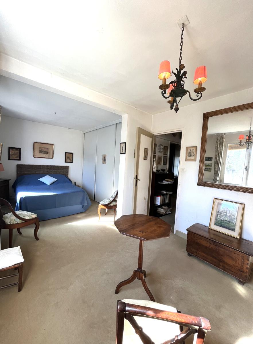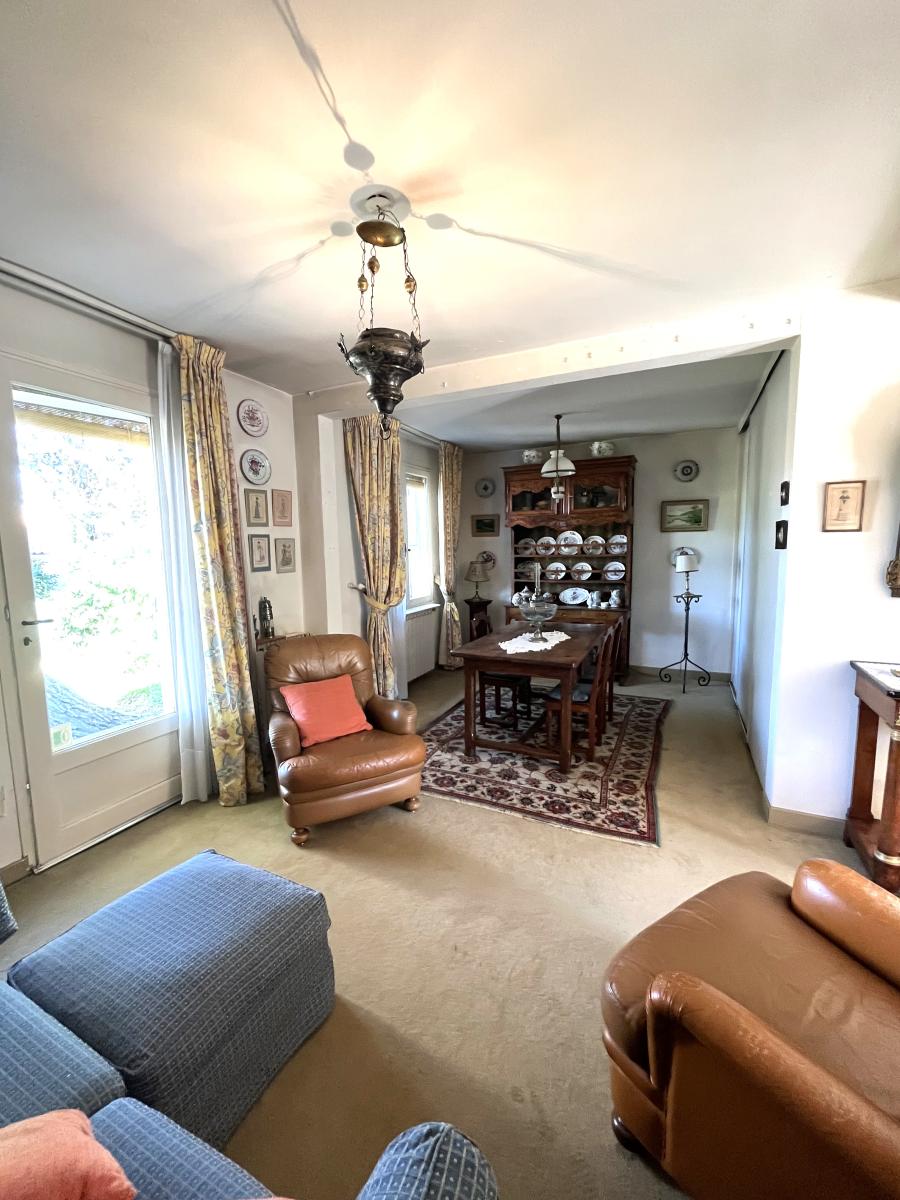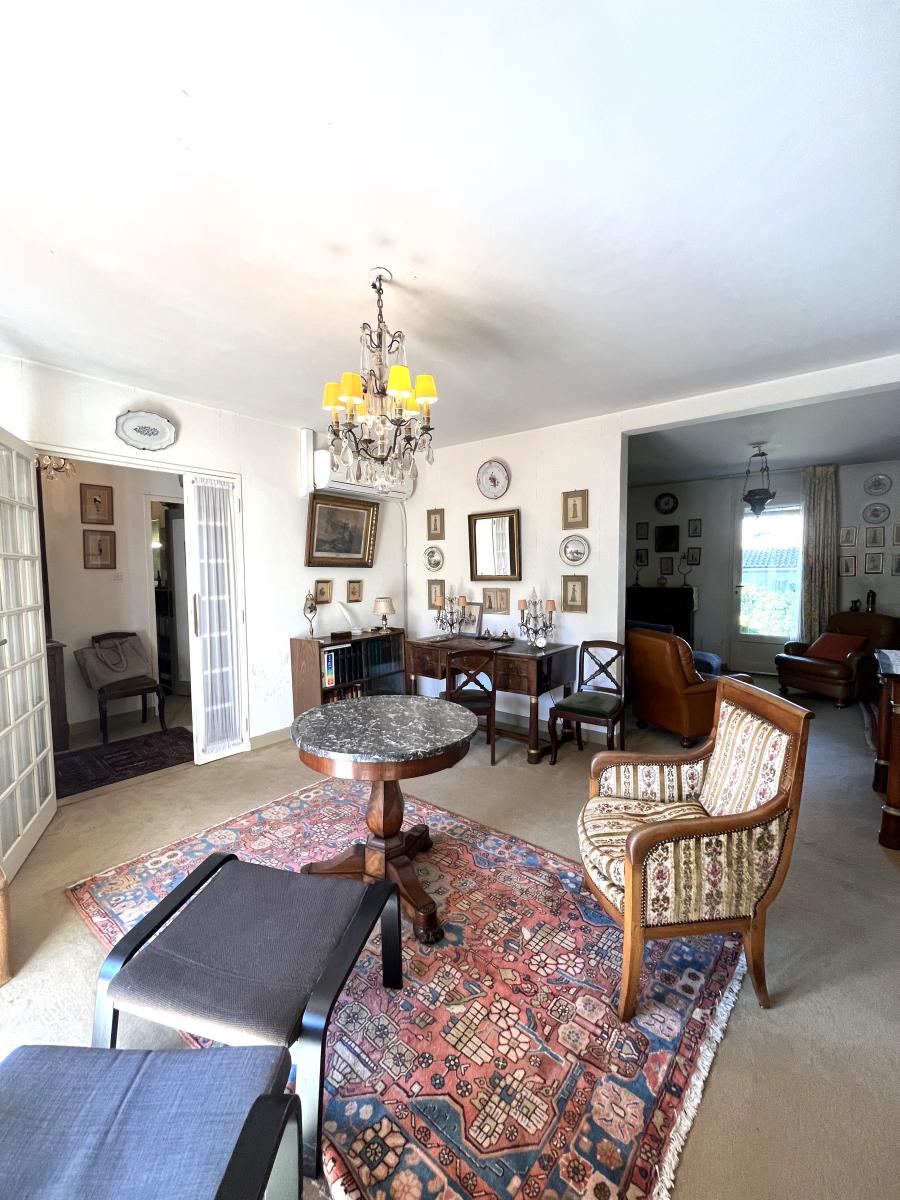 Le salon séjour, lumineux et convivial, s’ouvre sur une grande terrasse et un jardin ombragé par un majestueux pin, offrant un cadre idéal pour les moments de détente en plein air.