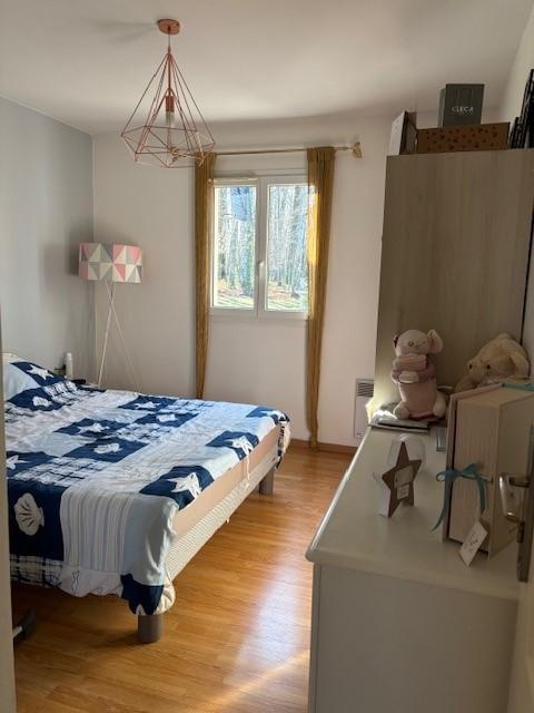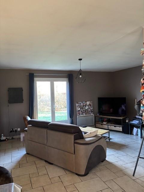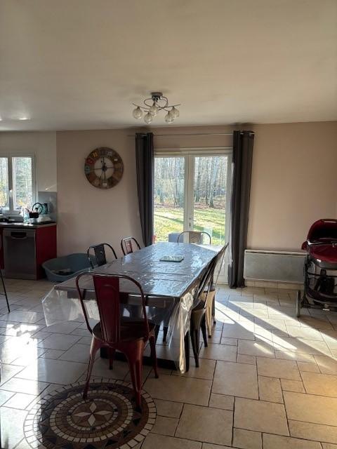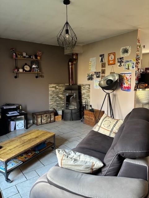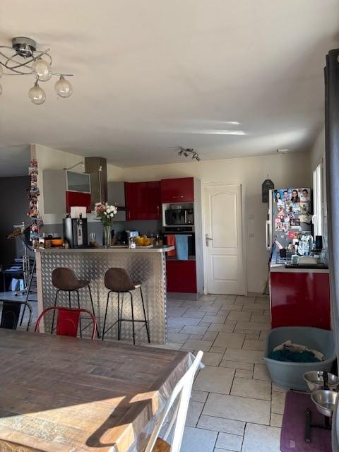 Entrée avec placards, pièce de vie avec un poêle à bois ouverte sur une cuisine aménagée et équipée, cellier, dégagement distribuant trois chambres, une salle de bains et douche, wc et lave-mains