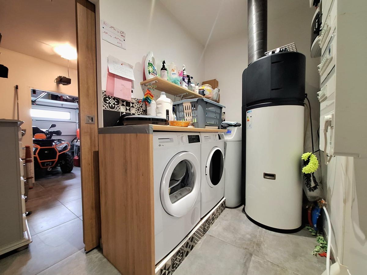 La maison dispose également d’un garage carrelé et isolé de 19m², ainsi que d’un espace buanderie fonctionnel.
