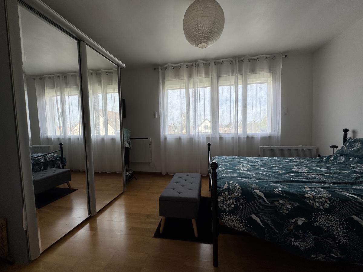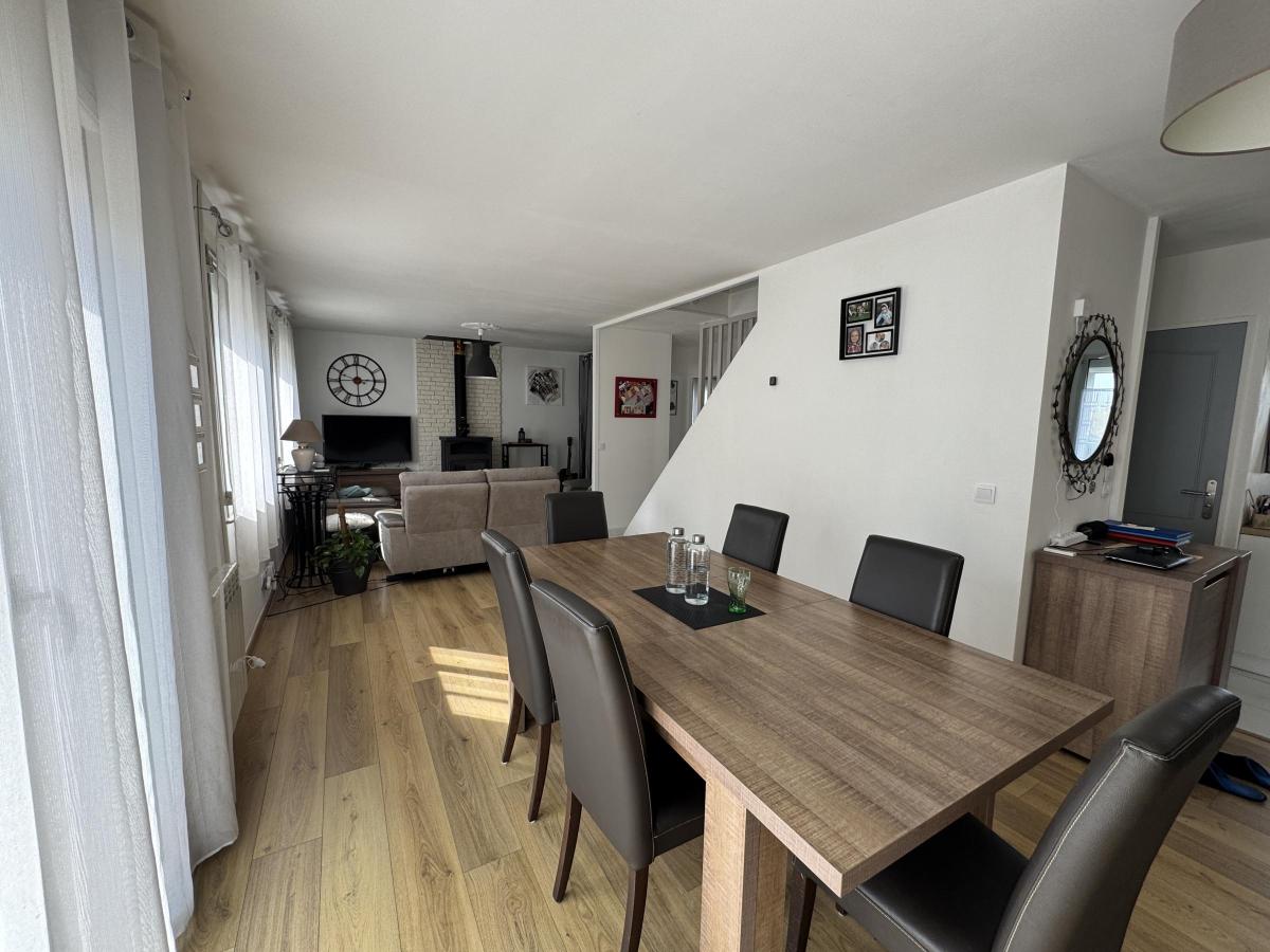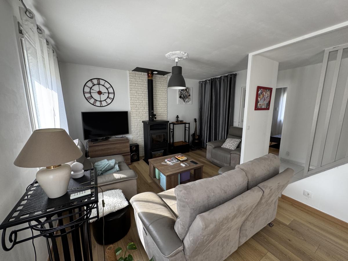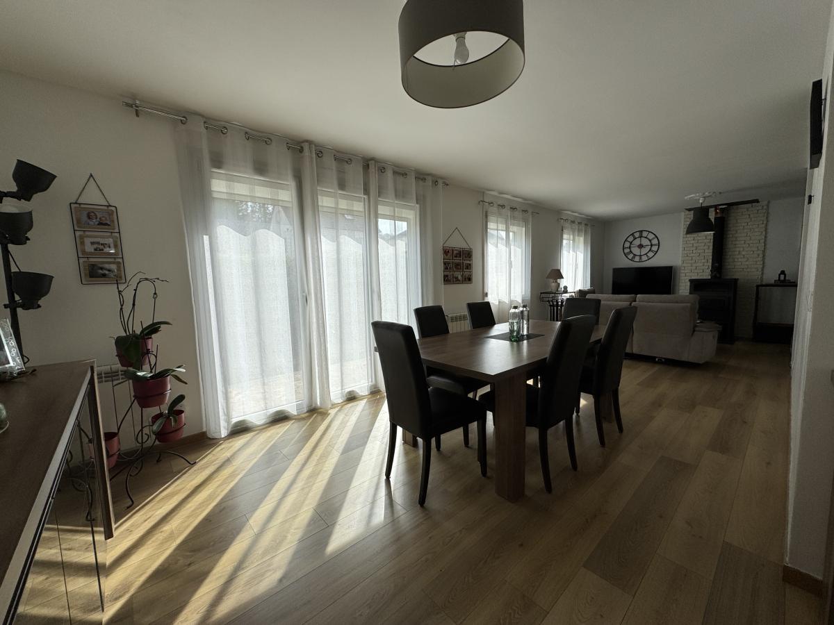 - Au rez-de-chaussée : Entrée, cuisine équipée et aménagée, dégagement, séjour double avec poêle à buche, une chambre, W.C. et salle de bains.