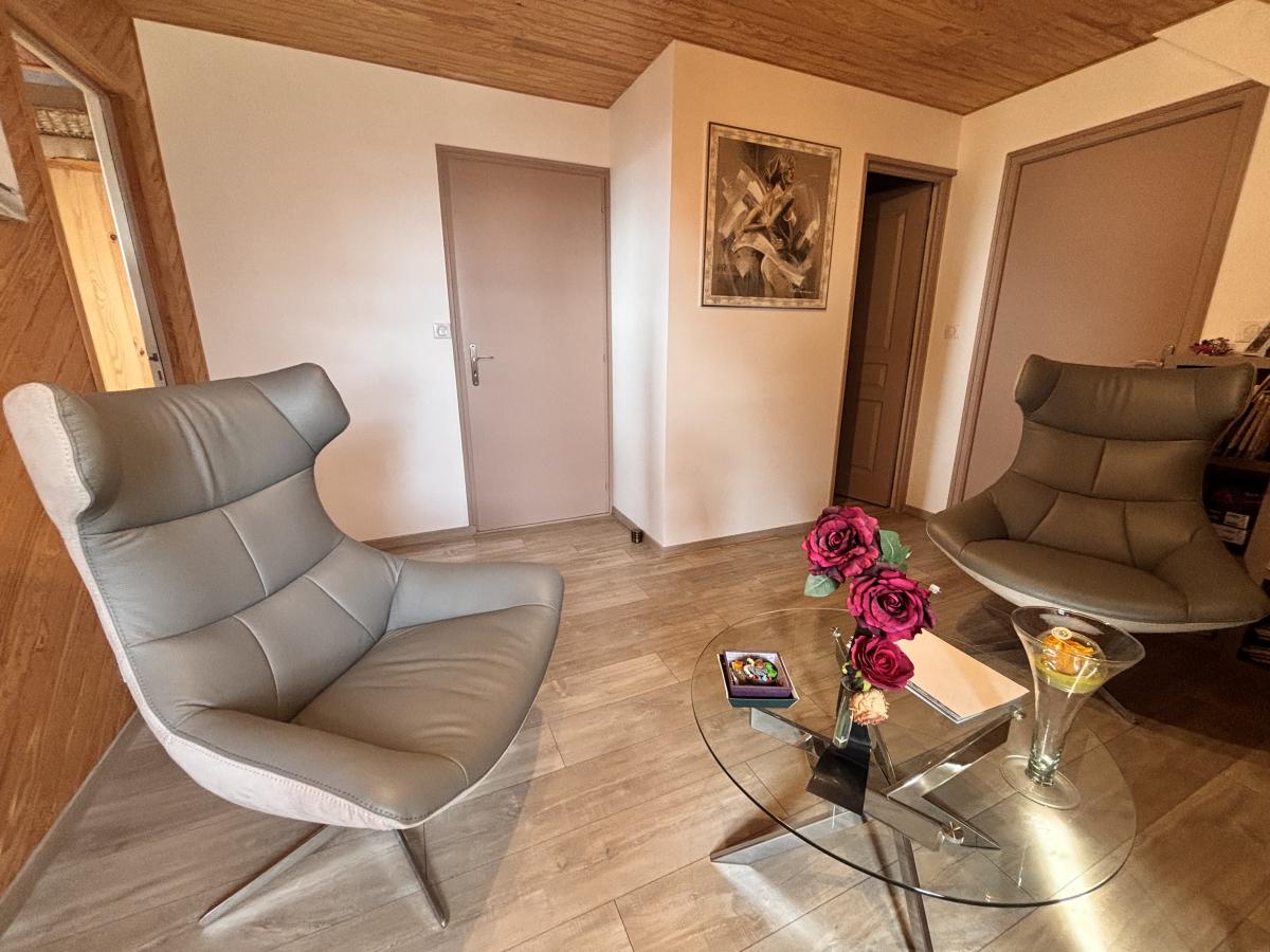 Au Rdc: Entrée, cuisine indépendante A/E, pièce à vivre avec poêle à bois, deux chambres, salle de bains + douche et wc