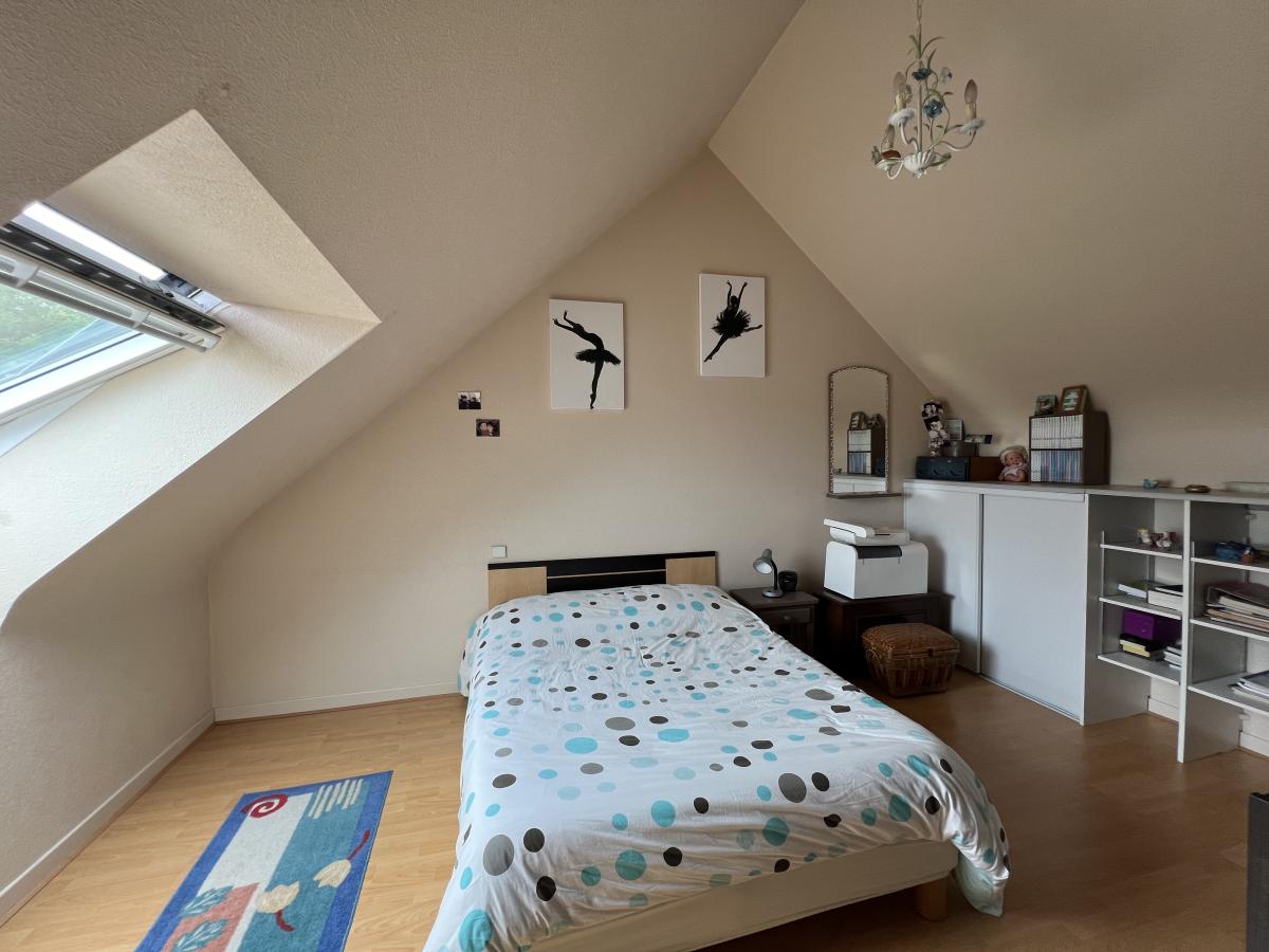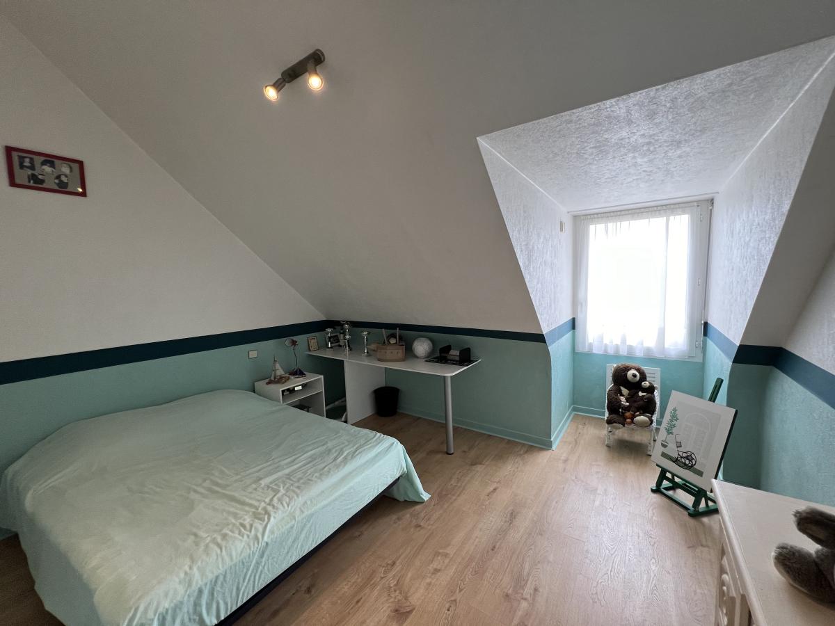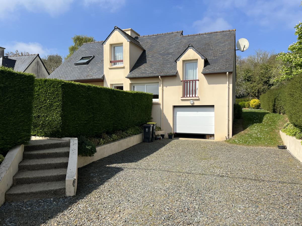 BINIC - Maison traditionnelle sur terrain de 813 m² comprenant : salon avec poêle à pellets, salle à manger, cuisine aménagée, cellier accès garage. (possibilité extension) A mi-palier : une chambre avec placard, salle d'eau récente avec placard, wc, avec grenier au-dessus (pièce supplémentaire possible). A l'étage : palier avec coin bureau, deux chambres, salle d'eau. Garage, cour, jardin paysagé clos. Environnement calme et agréable, non loin des commodités.
