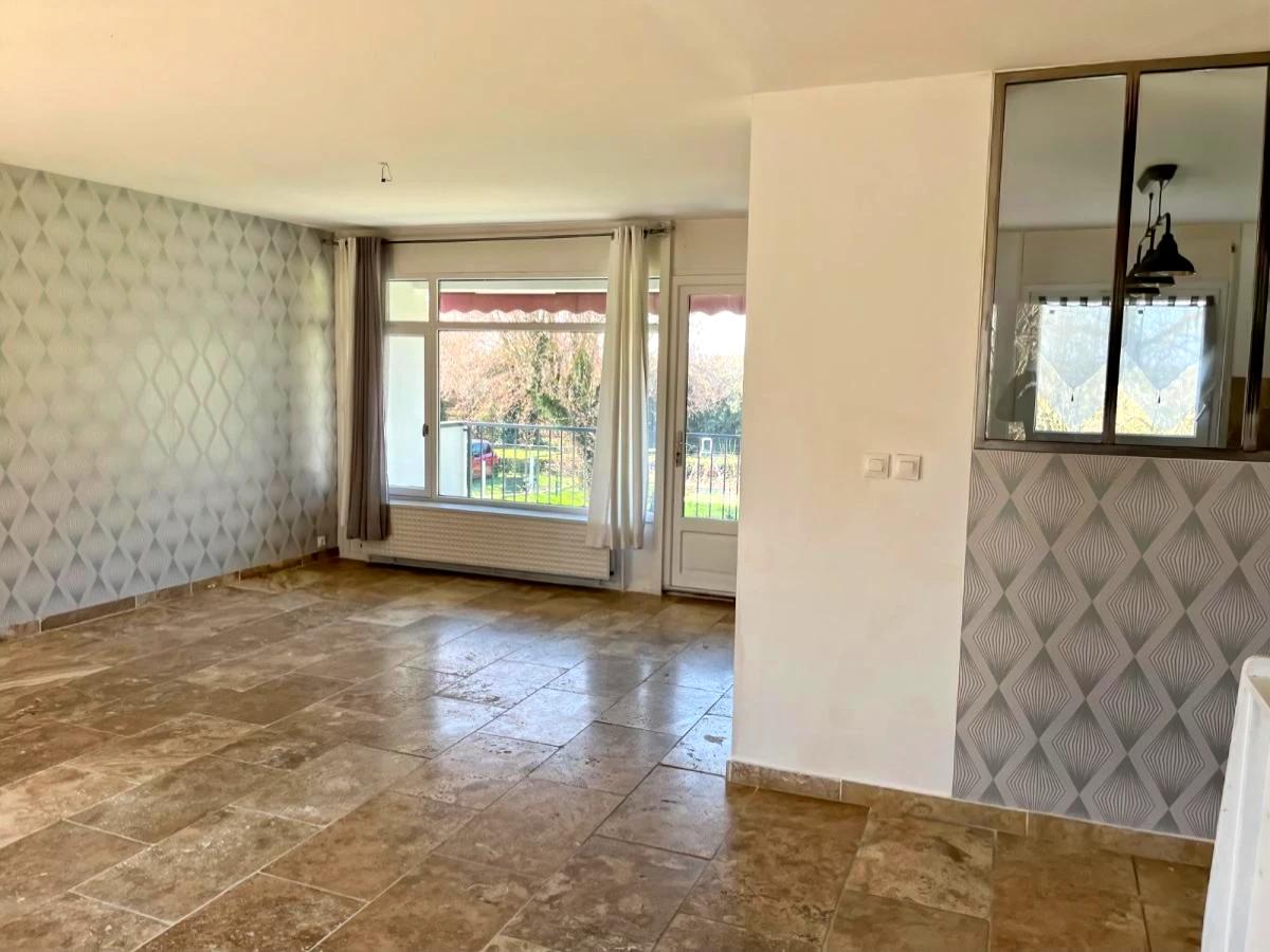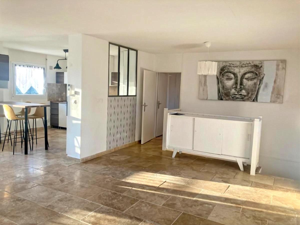 Un salon-séjour traversant et lumineux, ouvert sur une cuisine équipée conviviale.