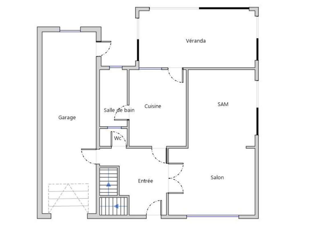 Vous y trouverez au rez-de-chaussée un hall d'entrée donnant accès à la cave, aux WC, au Salon-Salle à manger (avec cheminée), une cuisine, la salle de bains, ainsi qu'une véranda.