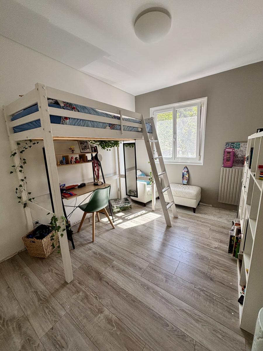 Au rez-de-chaussée, vous trouverez une pièce de vie avec cuisine ouverte sur le séjour, offrant un espace fonctionnel et convivial. Deux chambres ainsi qu’une salle de bain avec WC complètent ce niveau.
