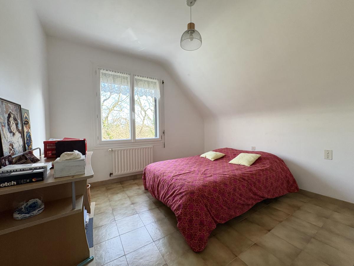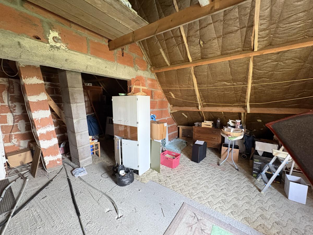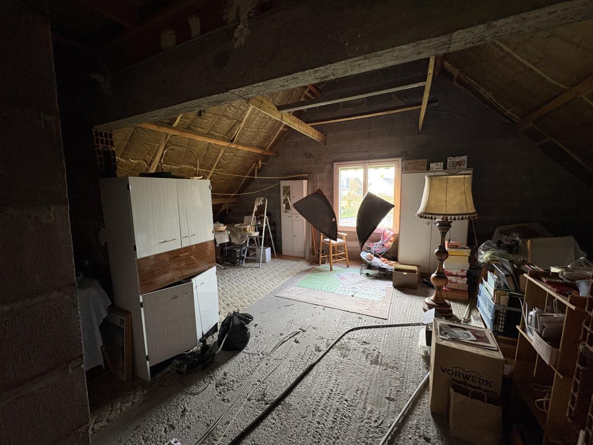 À l’étage, deux chambres, un espace avec placard et un vaste grenier aménageable sur plancher béton laissent entrevoir un beau potentiel d’agrandissement (chambres supplémentaires, salle d’eau…).