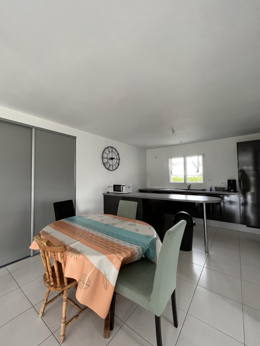 . Entrée, séjour/salon/cuisine aménagée ouverte, trois chambres, salle de bains/d'eau, deux wc dont un avec lave-mains, cellier, garage.