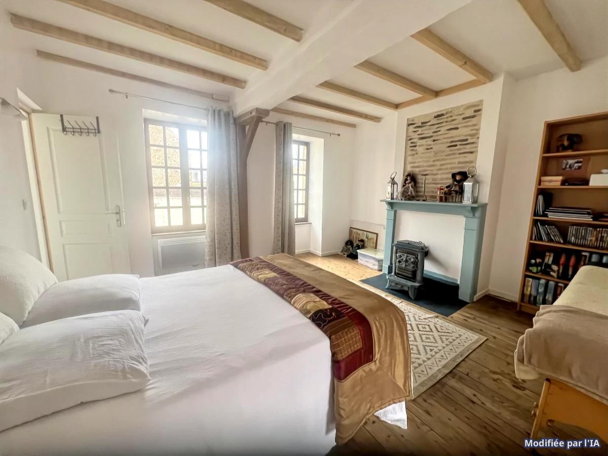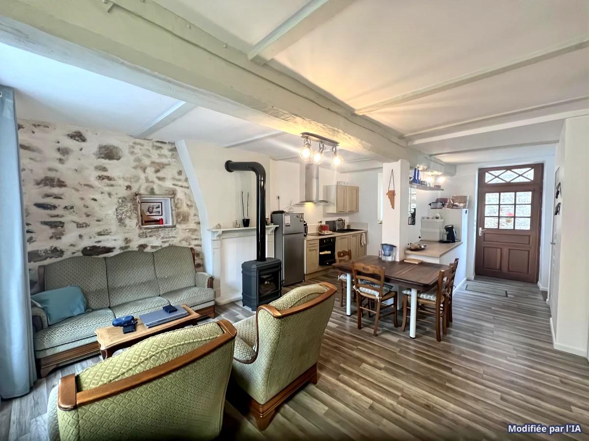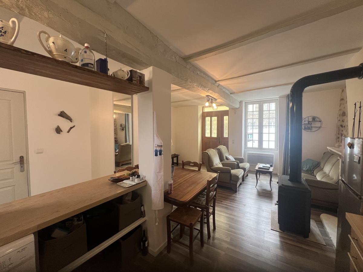 . RDC : séjour avec cuisine équipée et poêle à bois, grande chambre (pouvant être utilisée en salon), salle d'eau et WC.
