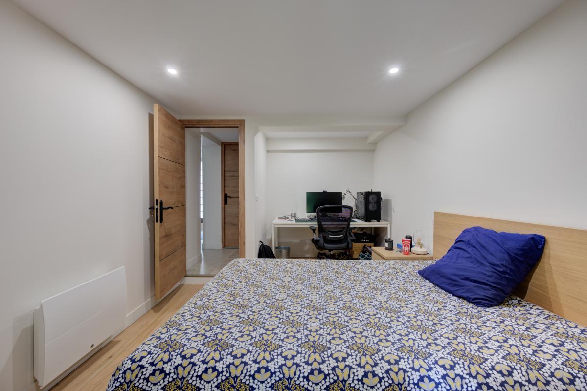 L’entrée distribue une salle d’eau avec WC, un bureau, un dressing ainsi que deux chambres, dont une dispose d’une sortie privative. Le bureau, actuellement utilisé comme salle de jeux, peut aussi faire office de chambre d’amis ou de local pour un véhicule type moto, vélo ou autre.