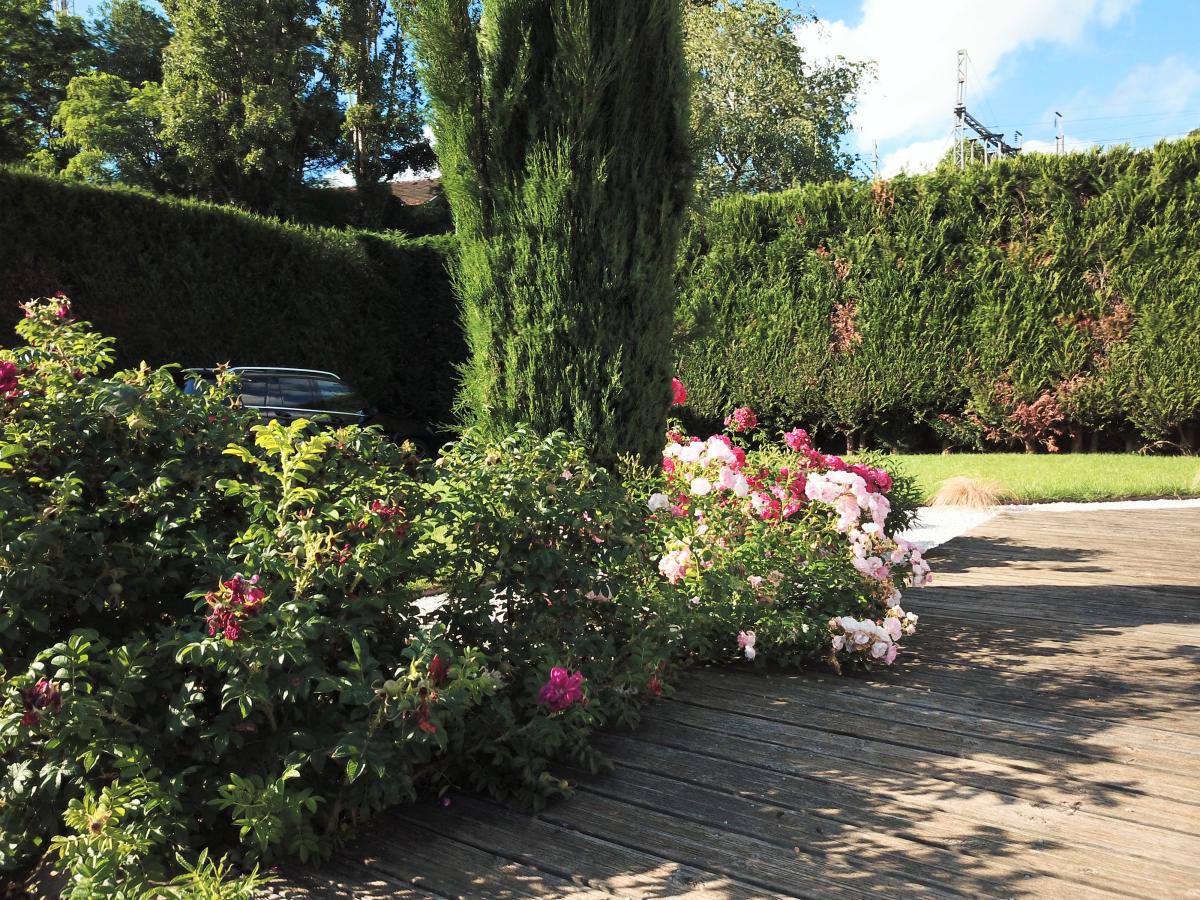 Terrain engazonné et arboré, clos de mur et cyprès, allée en pavés et parking;