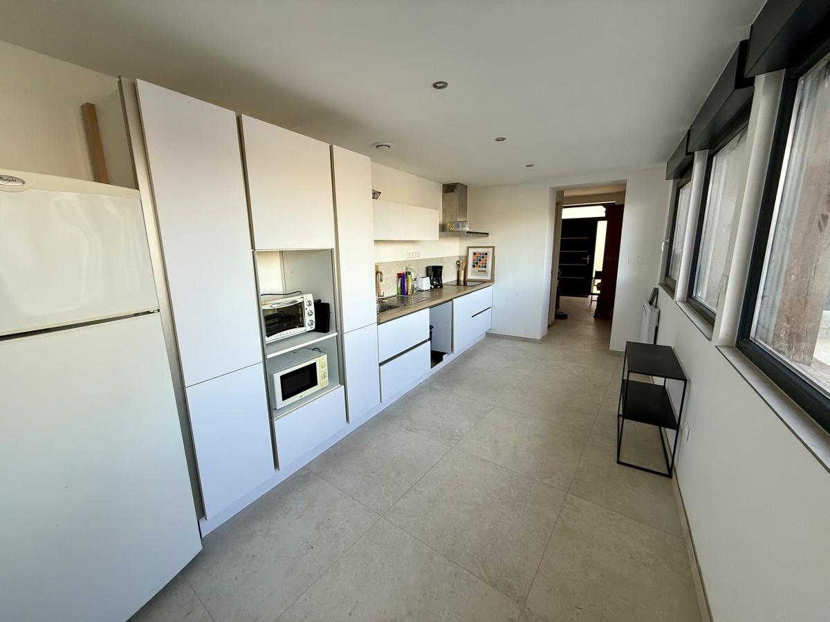 La cuisine séparée de 15m² donne sur la terrasse et permet l'accès à la 1ere salle d'eau intégrant une douche et sa vasque, un espace buanderie et un grand wc.