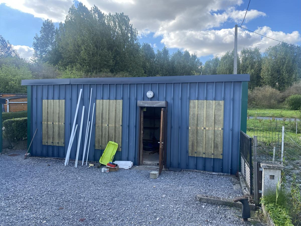 HAMEL - Secteur marais - construction légère de loisirs récente : entrée, WC, séjour avec cuisine équipée, salle d'eau, 3 coins nuit. Pompe à chaleur - Dépendance.