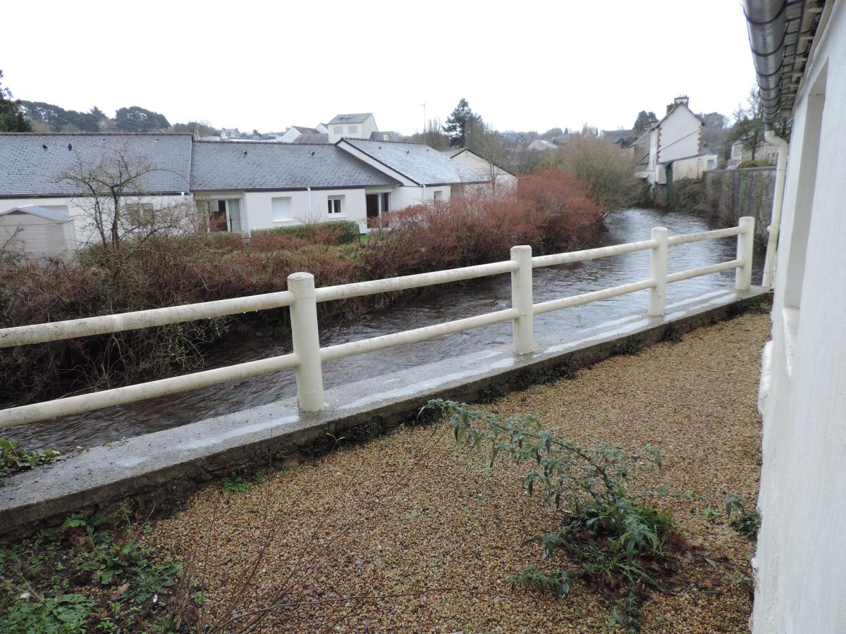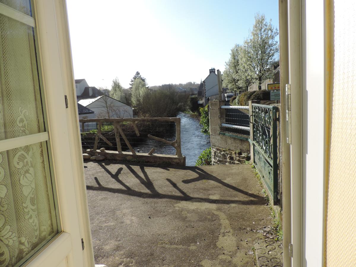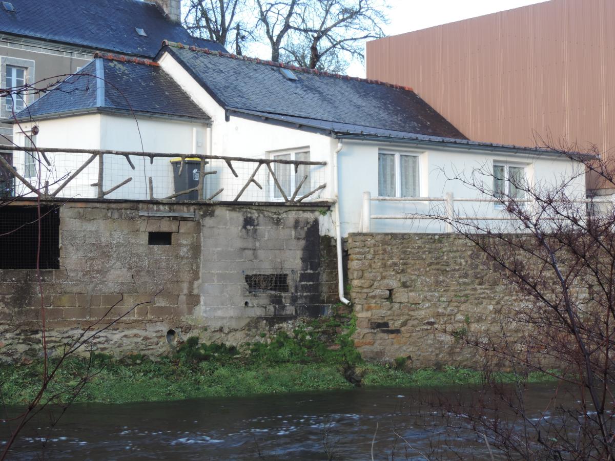 Surplombant la rivière, une maison d'environ 60m² comprenant : Une entrée/bureau, une cuisine, un séjour, deux chambres, une salle d'eau avec w.c, un débarras et une cave.